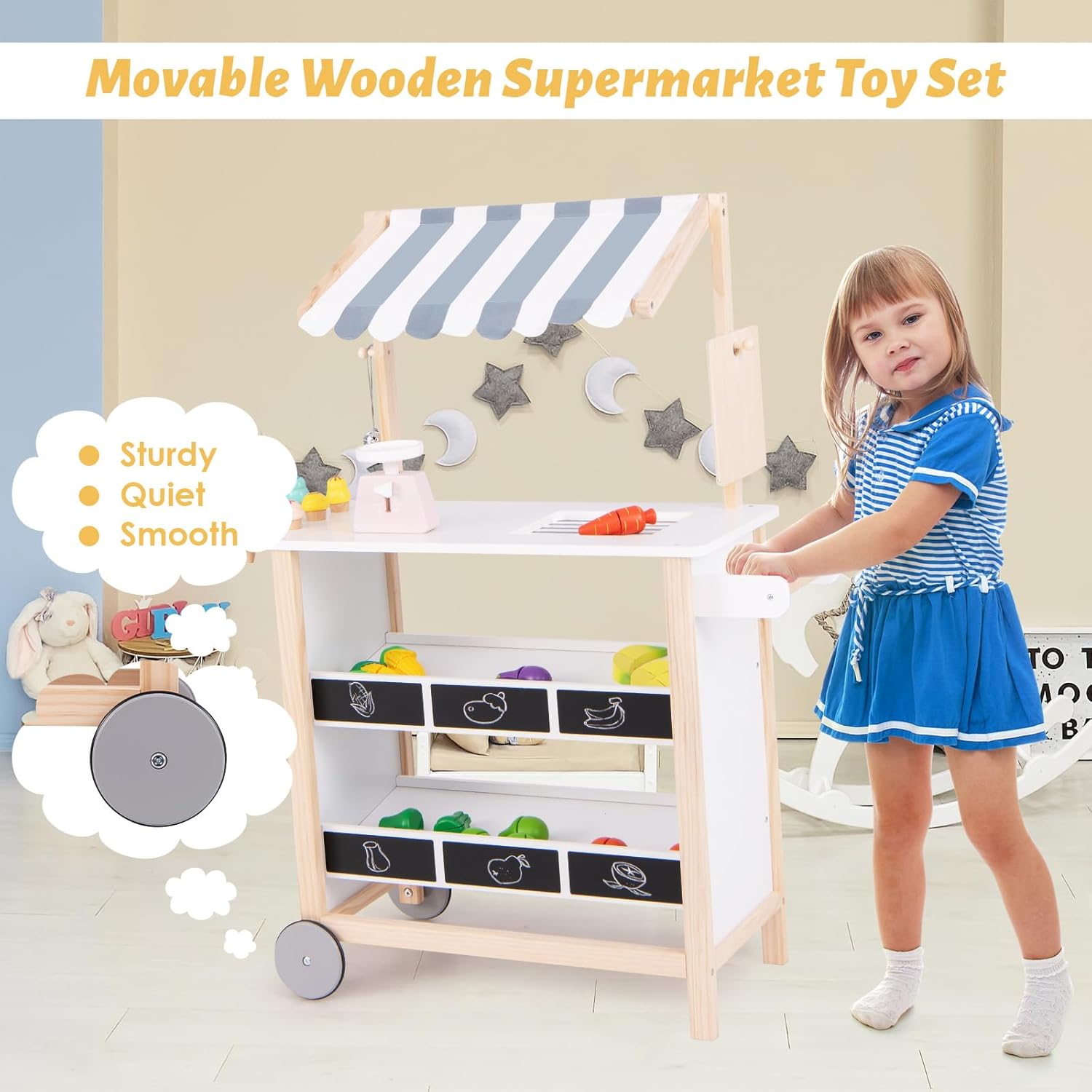 - 🍦~Sicheres und zuverlässiges Design~ Der Lebensmittelladen ist aus hochwertigem MDF und Kiefernholz gefertigt, um Haltbarkeit und Stabilität zu gewährleisten. Das Design mit den abgerundeten Ecken schützt Kinder vor Verletzungen und gibt Eltern