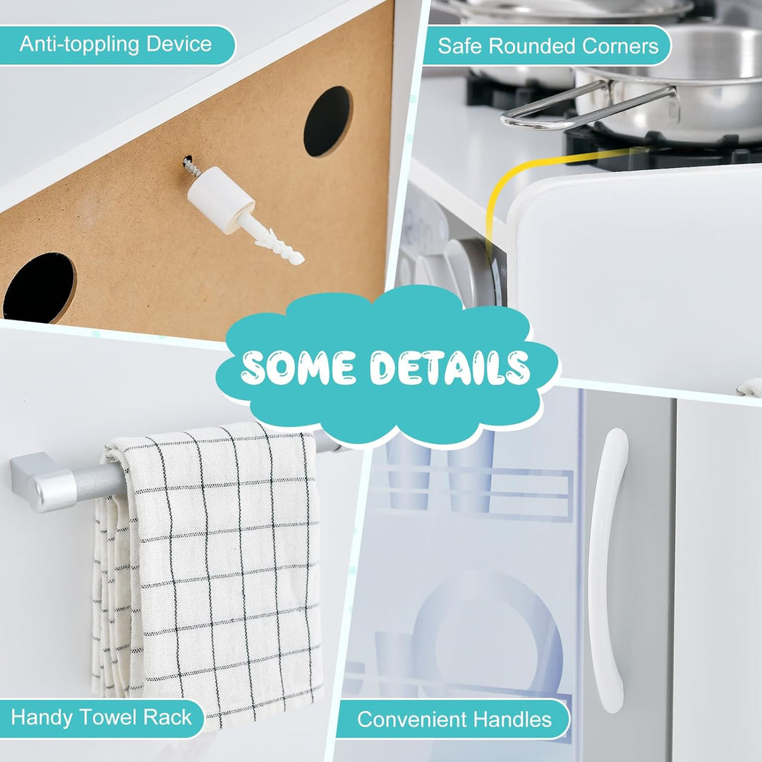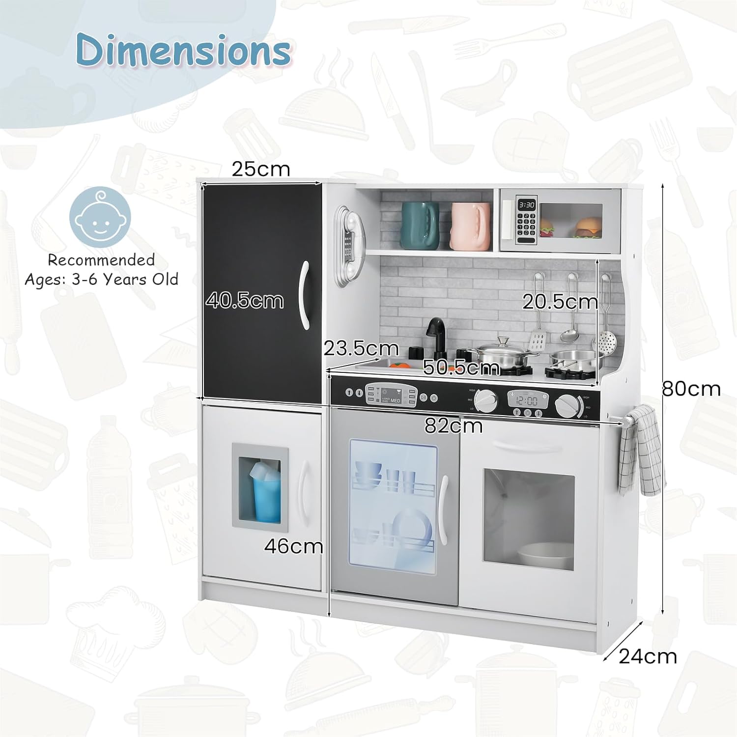 - Durchdachte Details: Die Arbeitsplatten in dem Küchenspielzeug sind 46 cm hoch und für Kinder im Alter von 3-6 Jahren geeignet. Die Griffe an den einzelnen Schränken sorgen dafür, dass die Kinder sie bequem und komfortabel nutzen können. Praktische