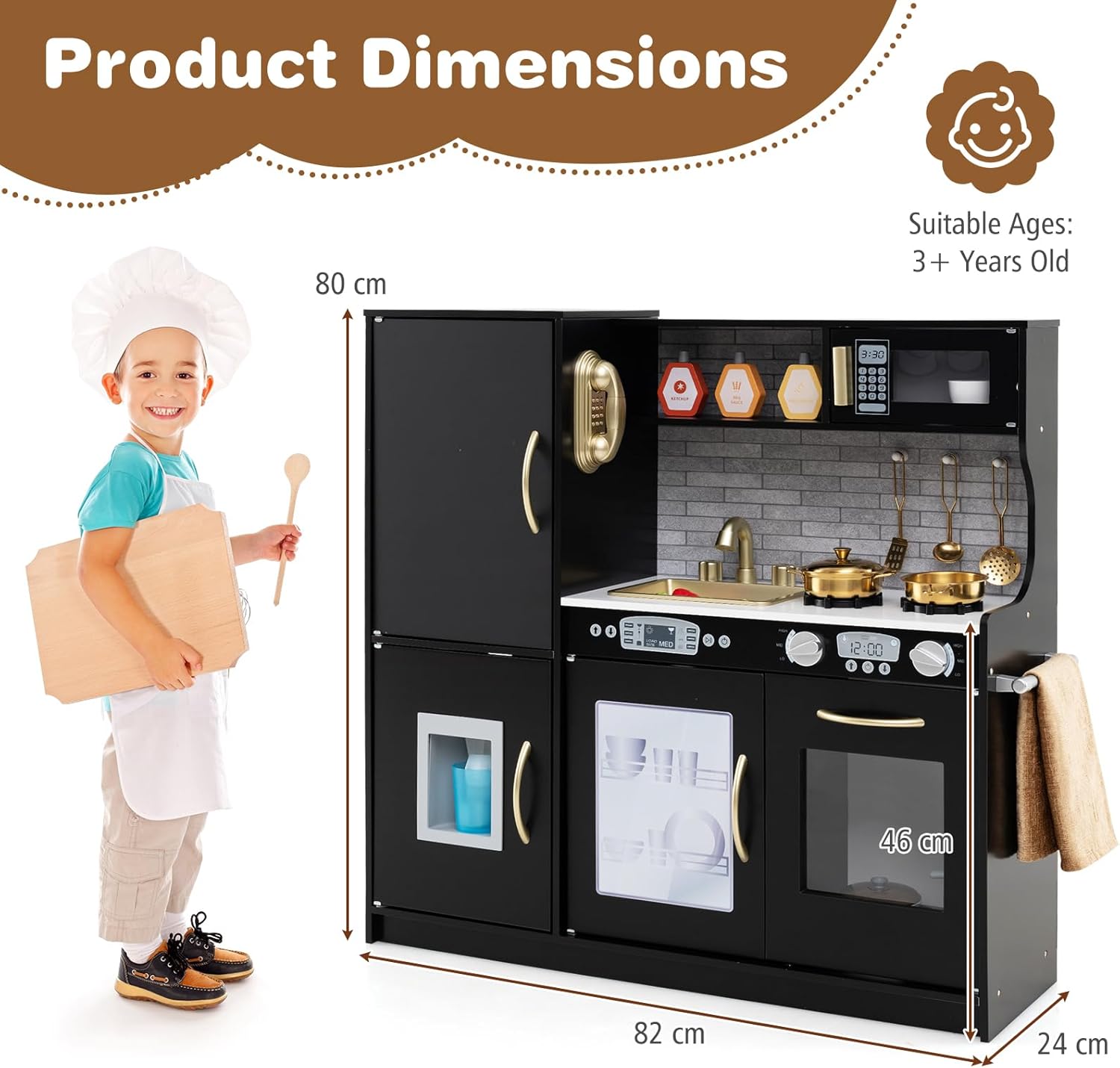 - Durchdachte Details: Die Arbeitsplatten in dem Küchenspielzeug sind 46 cm hoch und für Kinder im Alter von 3-6 Jahren geeignet. Die Griffe an den einzelnen Schränken sorgen dafür, dass die Kinder sie bequem und komfortabel nutzen können. Praktische