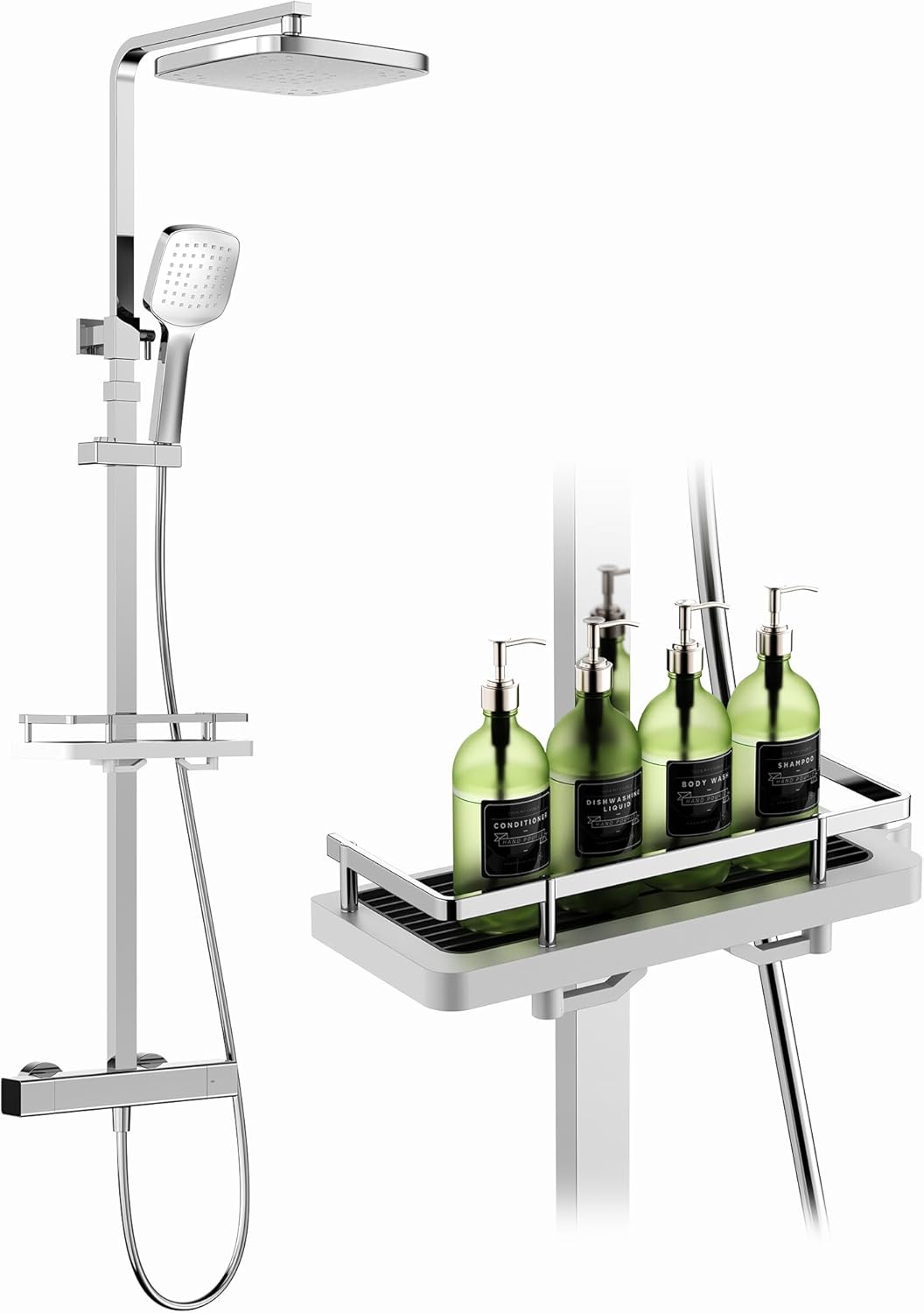 - 【Extra grosse Ablage (30 × 12 cm) mit drehbaren Haken】Platz für Shampoo, Duschgel und Pflegeprodukte (bis 10 kg belastbar). Die beweglichen Haken bieten zusätzlichen Stauraum für Schwamm, Bürste oder Rasierer