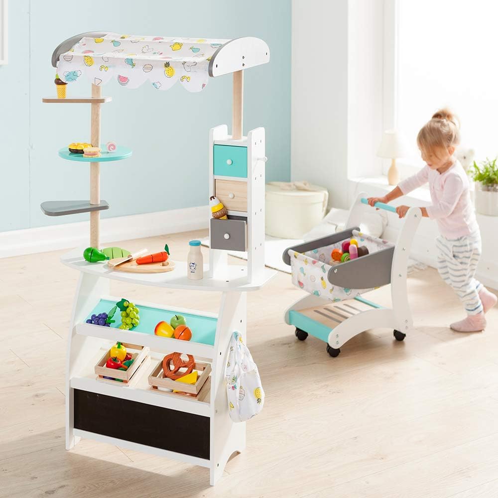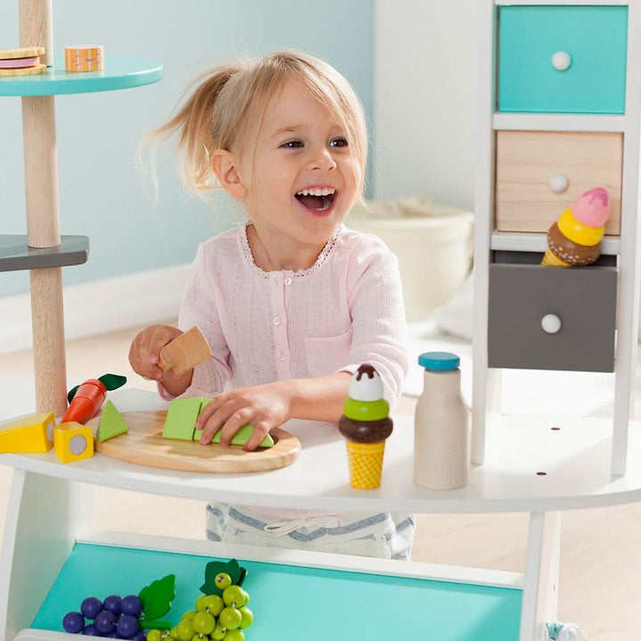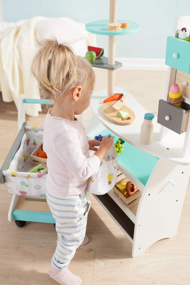 - Der Kaufladen ist rundum bespielbar und bietet viel Ablagefläche und 3 Kästchen