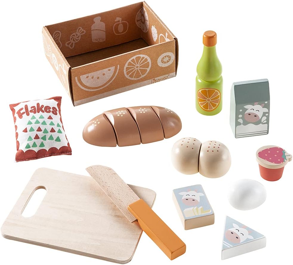 - Das liebevoll gestaltete Set aus Holz umfasst: Schneidbrett, Holzmesser, Aufbewahrungsbox, Brotlaib, Semmel, Flakes, Orangensaft, Milch, Erdbeermarmelade, Ei, Butter, Käse