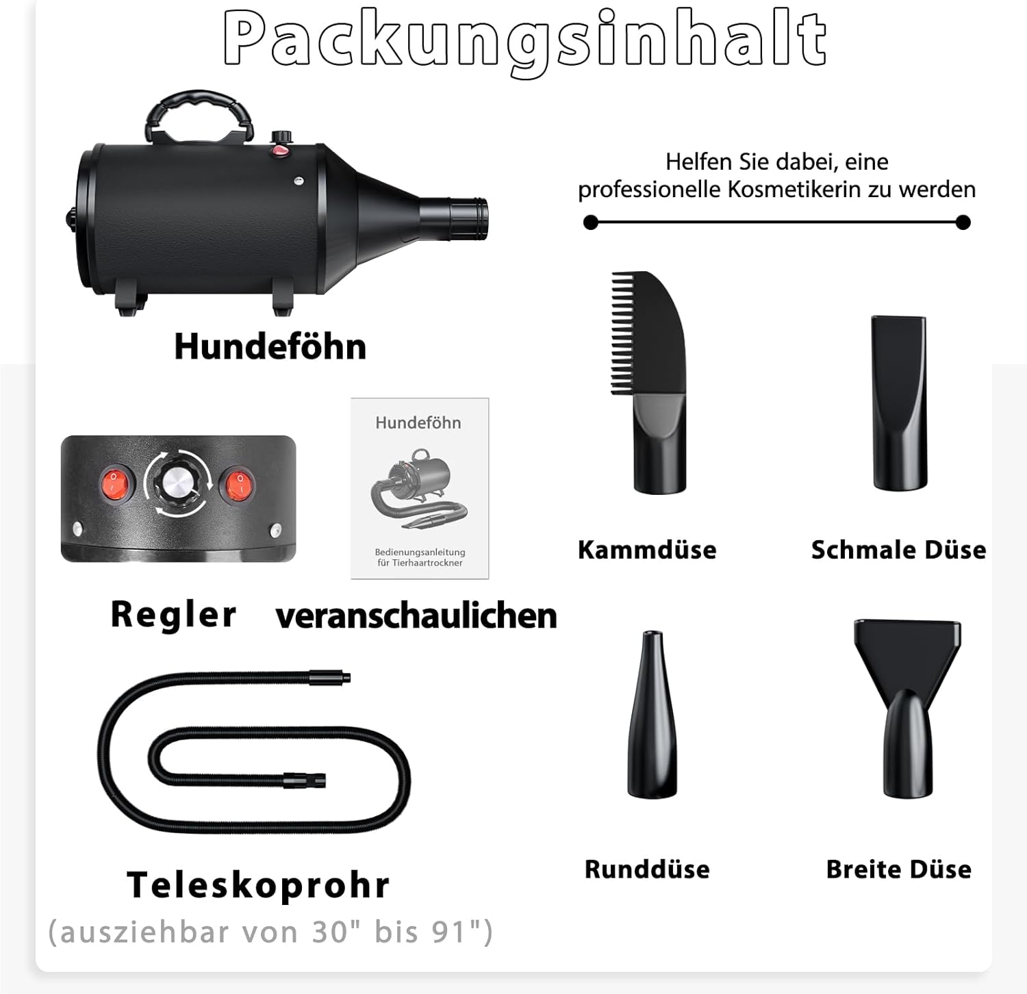 - 3000w stabile Ausgangsleistung: Hundefön ist mit einem aufgerüsteten 3200w Motor ausgestattet. Es kann kontinuierlich starke Leistung abgeben. Sie können den Knopf verwenden, um die Windgeschwindigkeit einzustellen, und der Geschwindigkeitsbereich ist