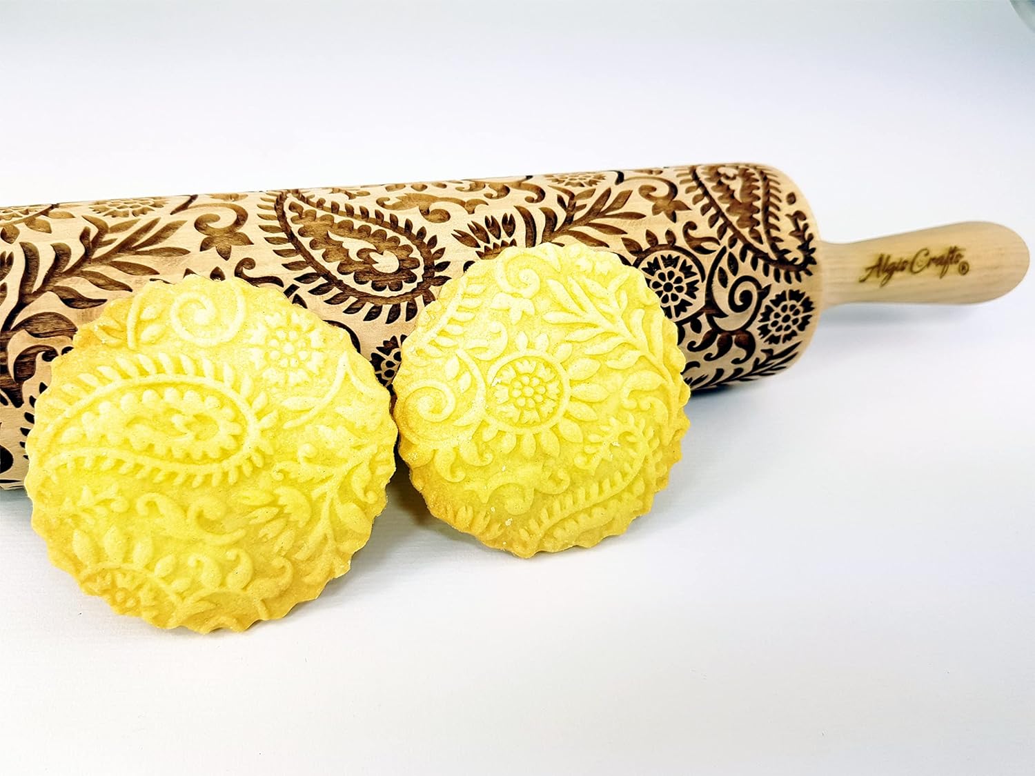 - Die Lasergravur wird auf dem Nudelholz angebracht und hinterlässt einen deutlichen Abdruck auf dem bearbeiteten Teig. Rollen Sie den Teig zuerst mit einem klassischen Nudelholz aus, anschliessend prägen Sie das Muster mit dem Prägenudelholz und