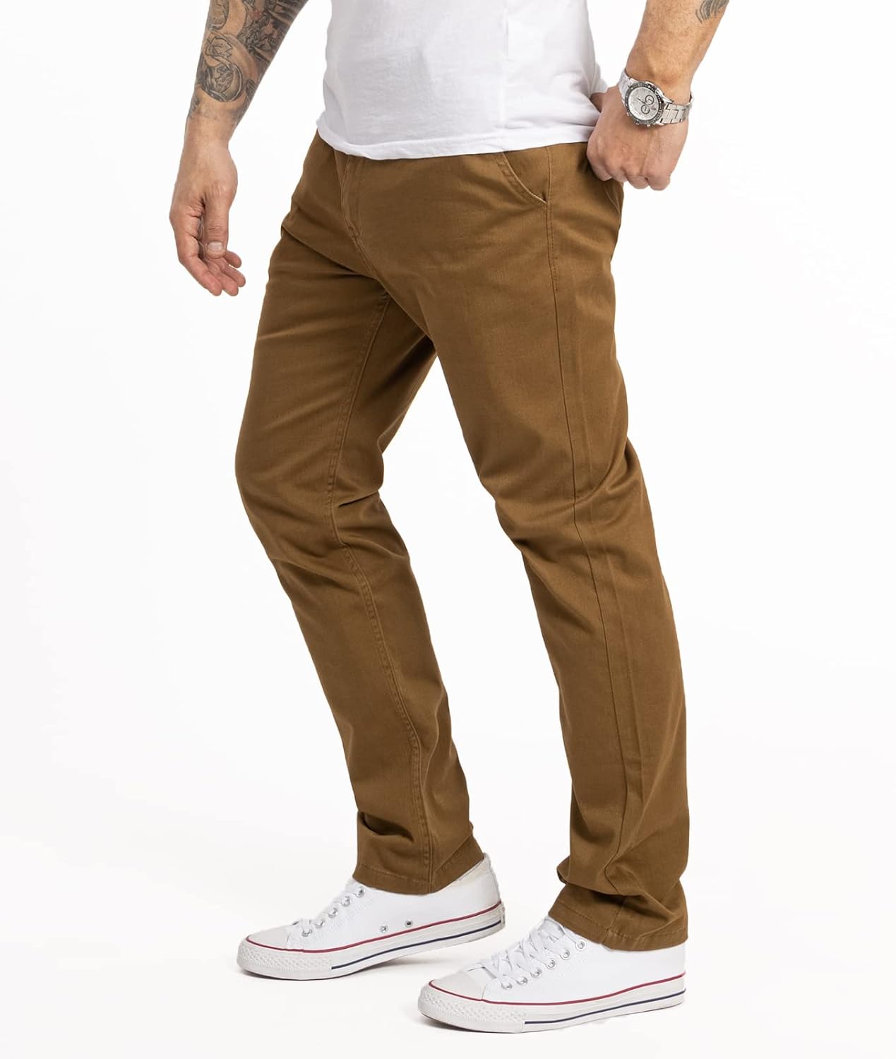 - Passform: Herren Chinos mit Regular Fit-Passform haben den Vorteil, dass Sie für nahezu jeden Figurtyp geeignet sind. Sie haben einen relativ lockeren Schnitt, ohne zu körperbetont zu sein. Dadurch wird das Bein optisch gestreckt. Gleichzeitig können