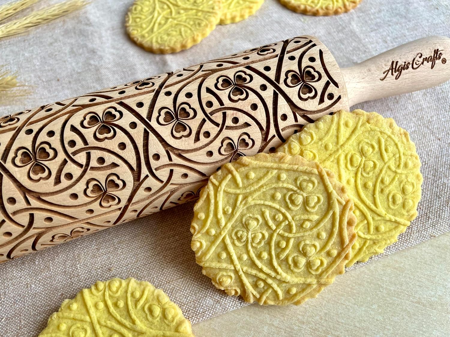 - Die Lasergravur wird auf dem Nudelholz angebracht und hinterlässt einen deutlichen Abdruck auf dem bearbeiteten Teig.