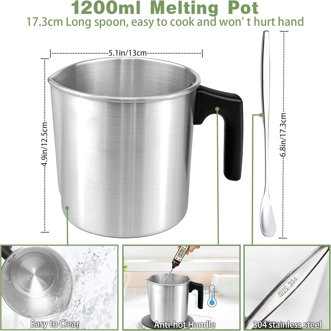 - Kerzen giessen topf 1200 ml: Der Schmelztiegel humanisierte anti-hot-Griff-Design verwenden, können Sie es halten, aber Ihre Hand nicht schaden. Wenn Sie Kerzen herstellen, können Sie mit einem 17 cm langen Wachslöffel umrühren, um das Schmelzen des