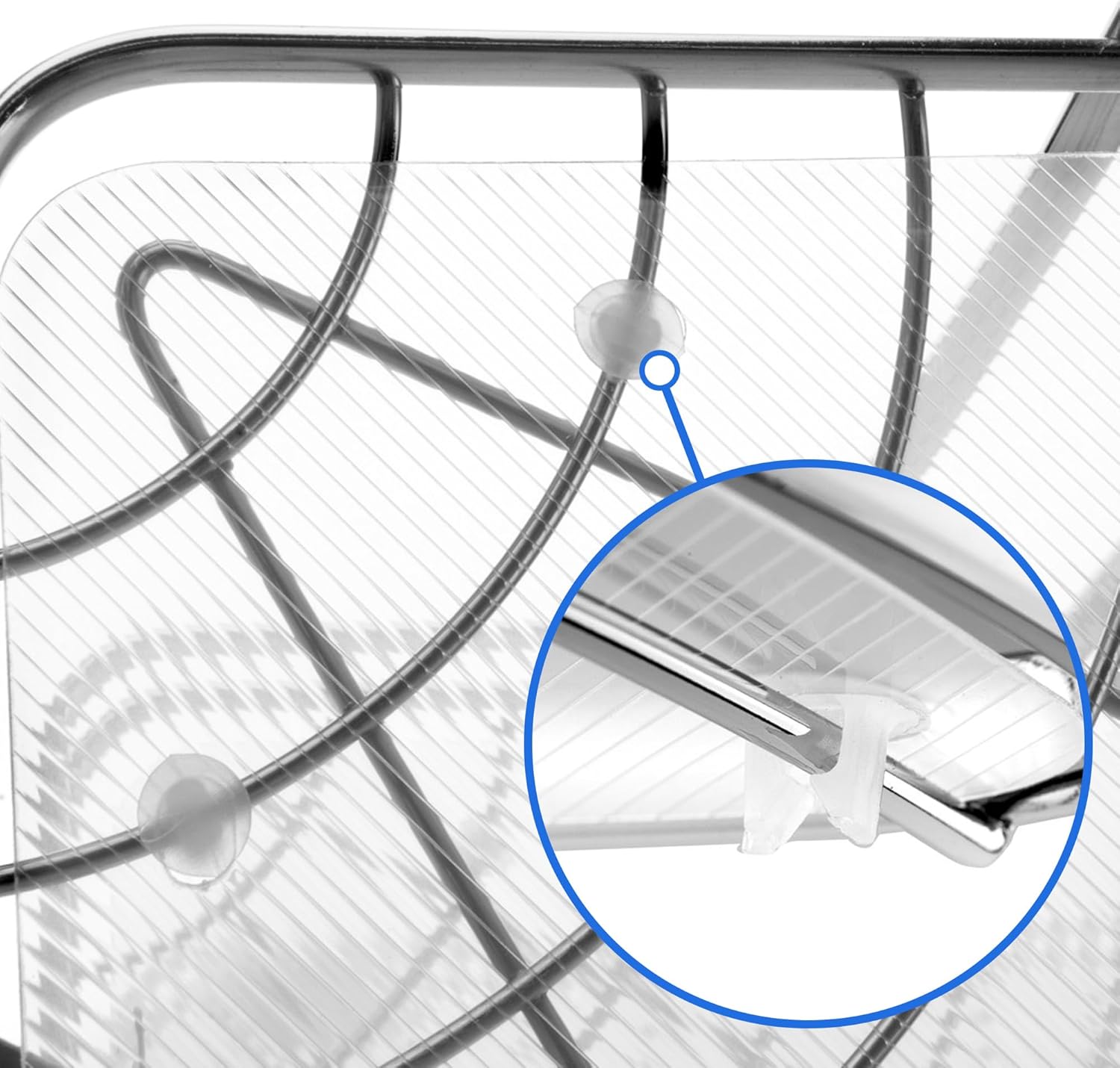 - DAS REGAL HAT ACHT HALTERUNGEN, an denen mit fünf Klammern ein durchsichtiger Kunststoffeinsatz auf den Draht befestigt wird. Mit dieser Lösung können Sie die Sauberkeit aufrechterhalten oder die Einlagen zerlegen, wenn Sie sie nicht benötigen. Die