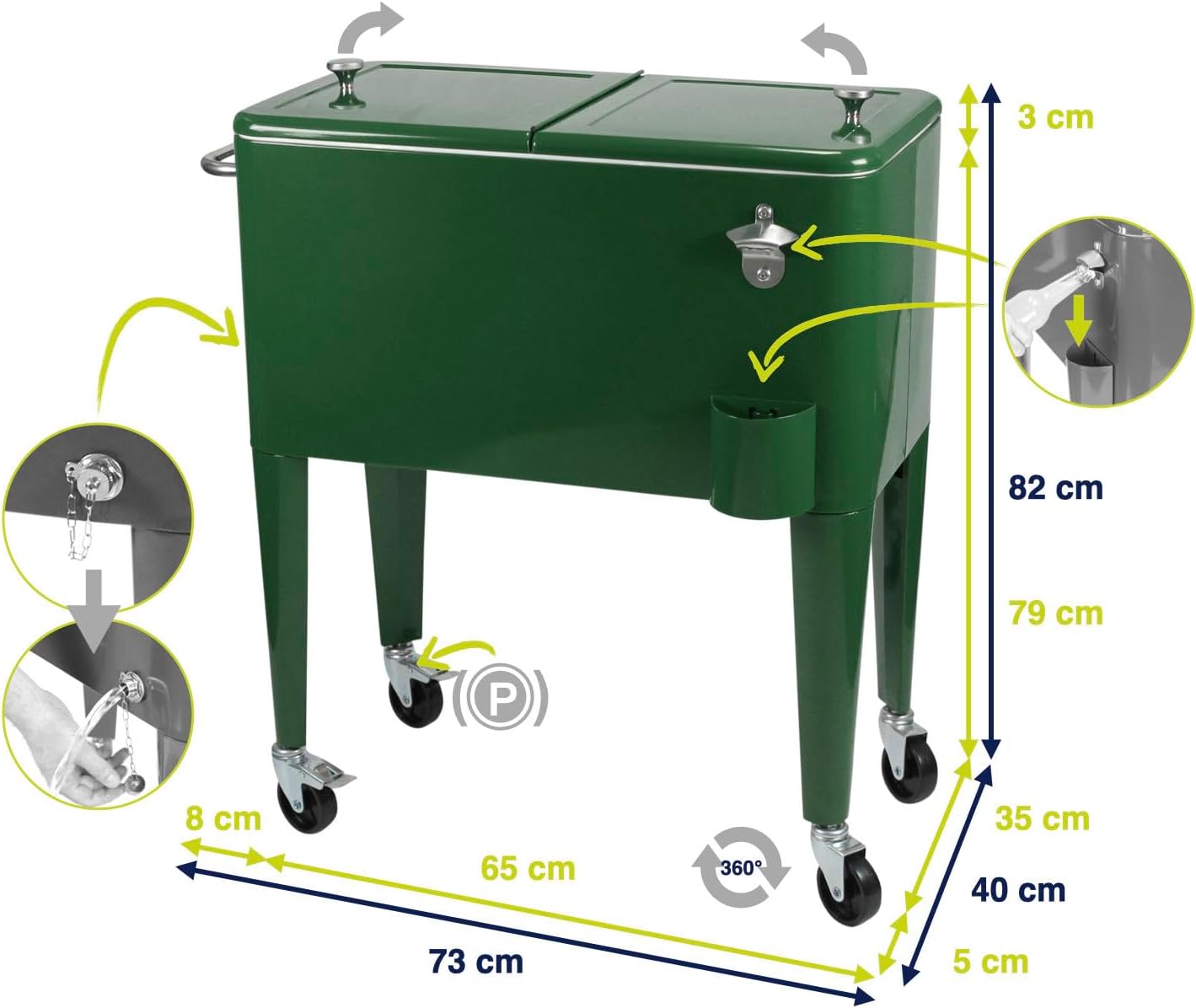 - Fassungsvermögen des Kühlwagens: ca. 60 Liter, Gewicht: ca. 13kg, Material: Metall und Kunststoff