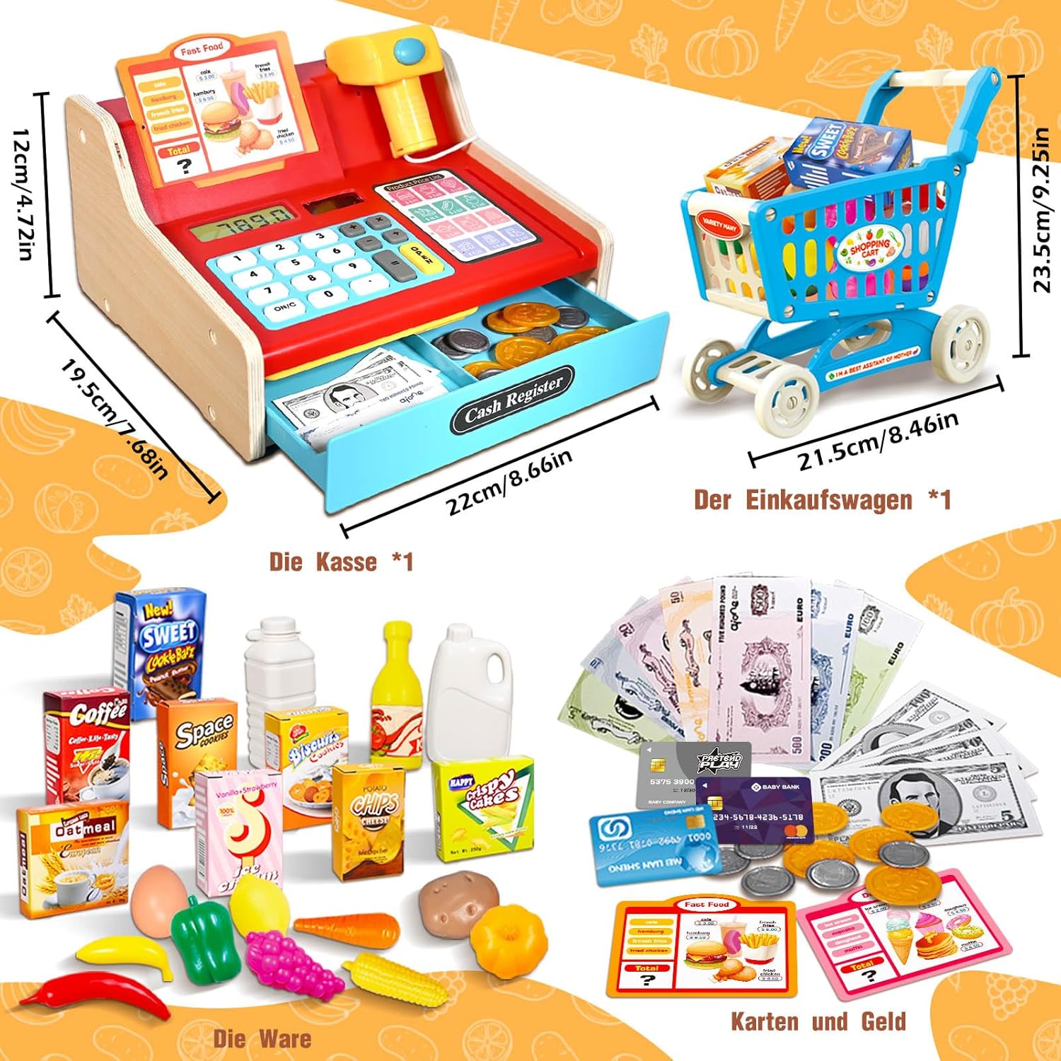 - 【40+ Premium-Zubehör】Alles dabei: Einkaufswagen, Spielgeld (Münzen & Scheine!), Kreditkarten, Lebensmittel (Obst/Gemüse!), Snacks uvm. Perfekt für stundenlangen Kaufladen-Spass ohne Vorbereitung!