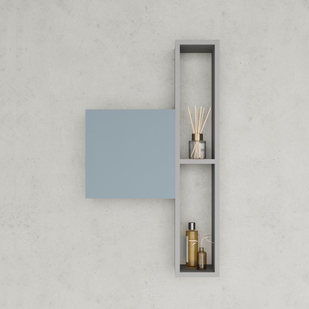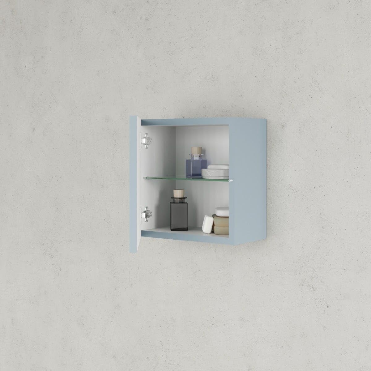 - 30CM QUADRATISCHER BAD-HÄNGESCHRANK 1 TÜR MATT HIMMELBLAU Diese quadratische Badezimmerwand in mattem Himmelblau ist wendbar und äusserst vielseitig. Die Struktur ist vollständig aus fsc-zertifiziertem MDF gefertigt und in mattem Himmelblau