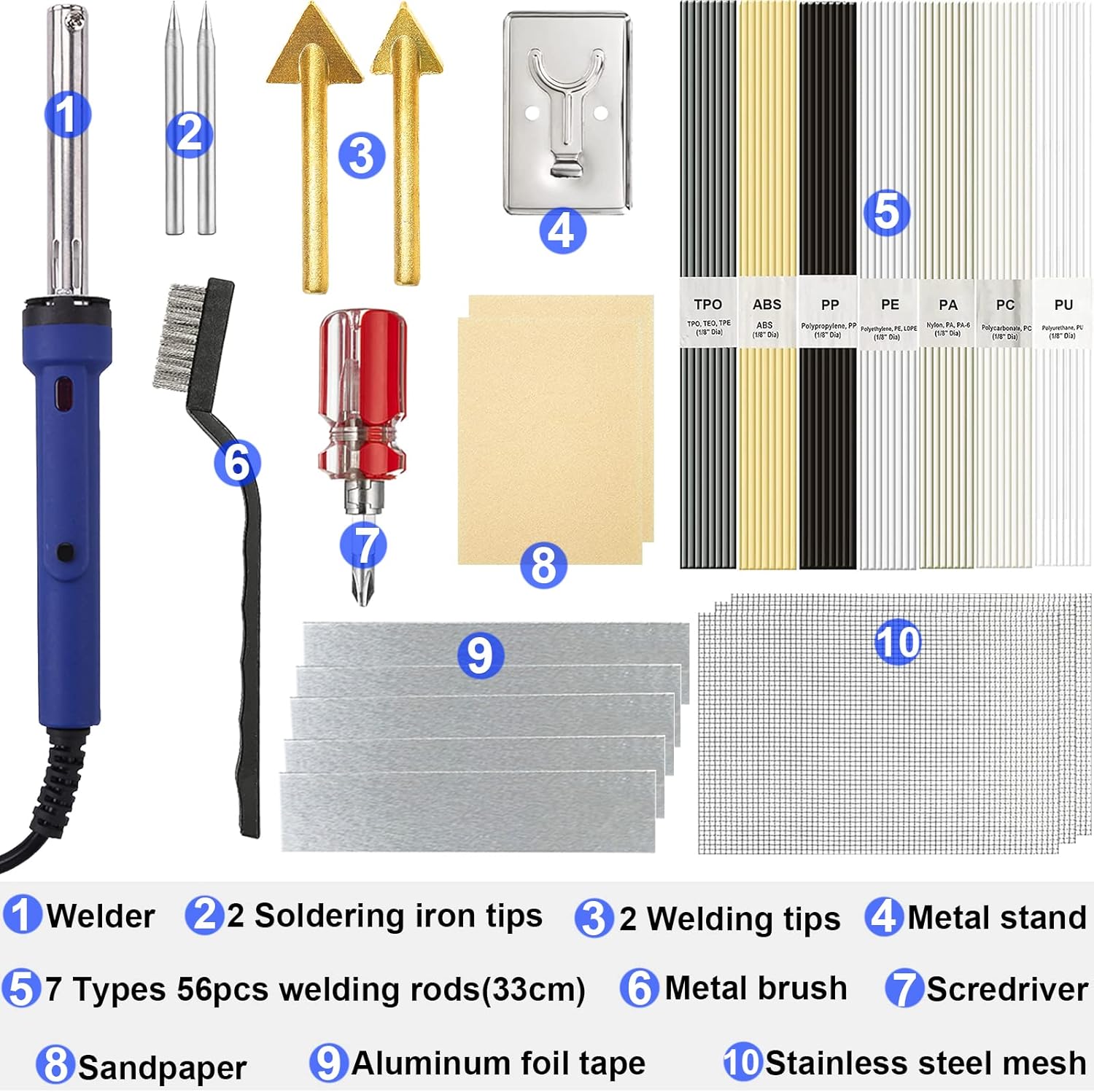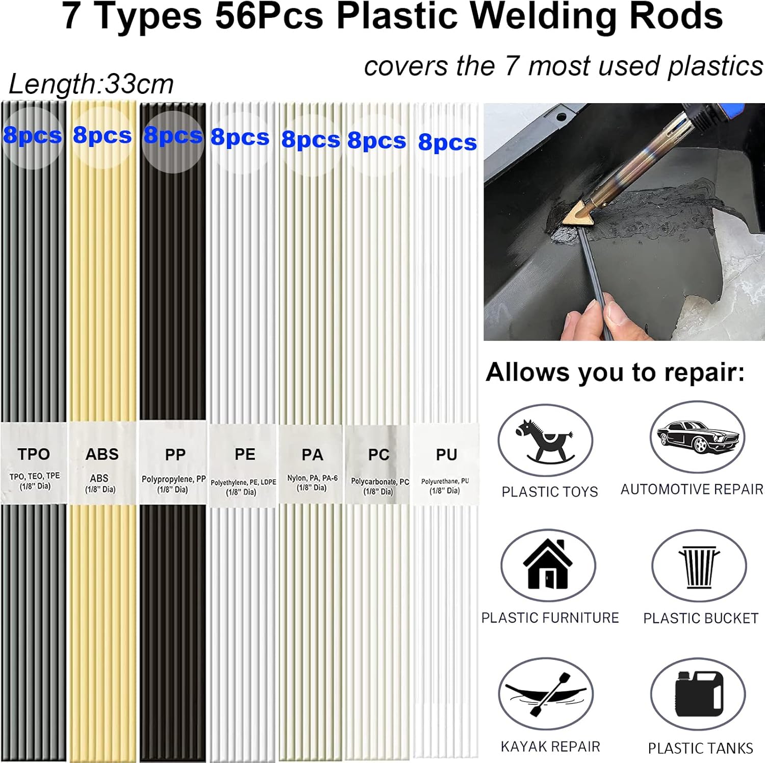 - 【7 Arten von Kunststoff-Schweissstäben】 Das Kunststoff-Reparaturset enthält 7 Arten (8 Stück/Typ) Kunststoff-Schweissstäbe (Polypropylen, Polyurethan, ABS, Polyethylen, TPO, Nylon, Polycarbonat) und deckt die 7 am häufigsten verwendeten Kunststoffe ab, die Sie leichter anpassen können Kunststofftyp für Ihr Grundmaterial für stärkere, nahtlose Kunststoffschweissnähte.