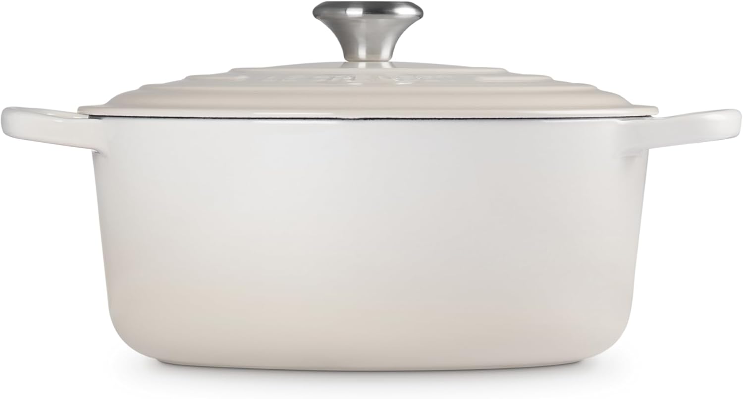 - Lieferumfang: 1x Le Creuset Signature Runder Bräter aus Gusseisen mit Deckel, Füllmenge: 6.7 Liter, Material: Emailliertes Gusseisen, Masse: 37.7 x 29.7 x 18.4 cm, Gewicht: 6.125 kg, Farbe: Meringue, 21177287164430