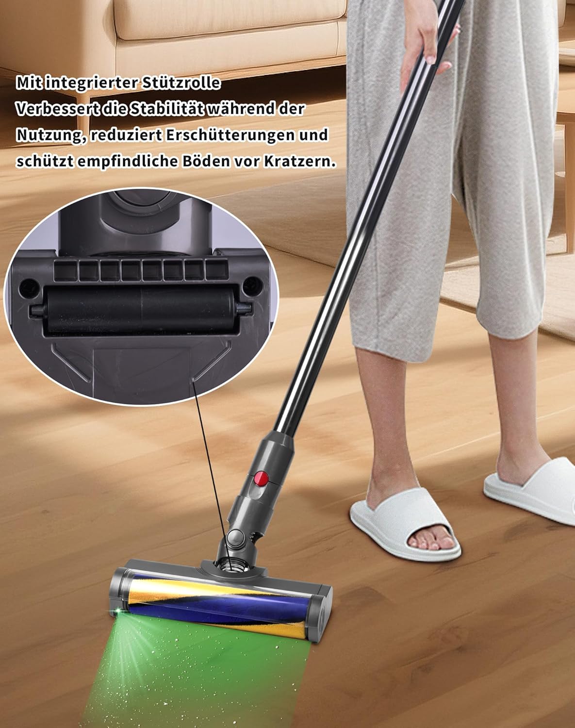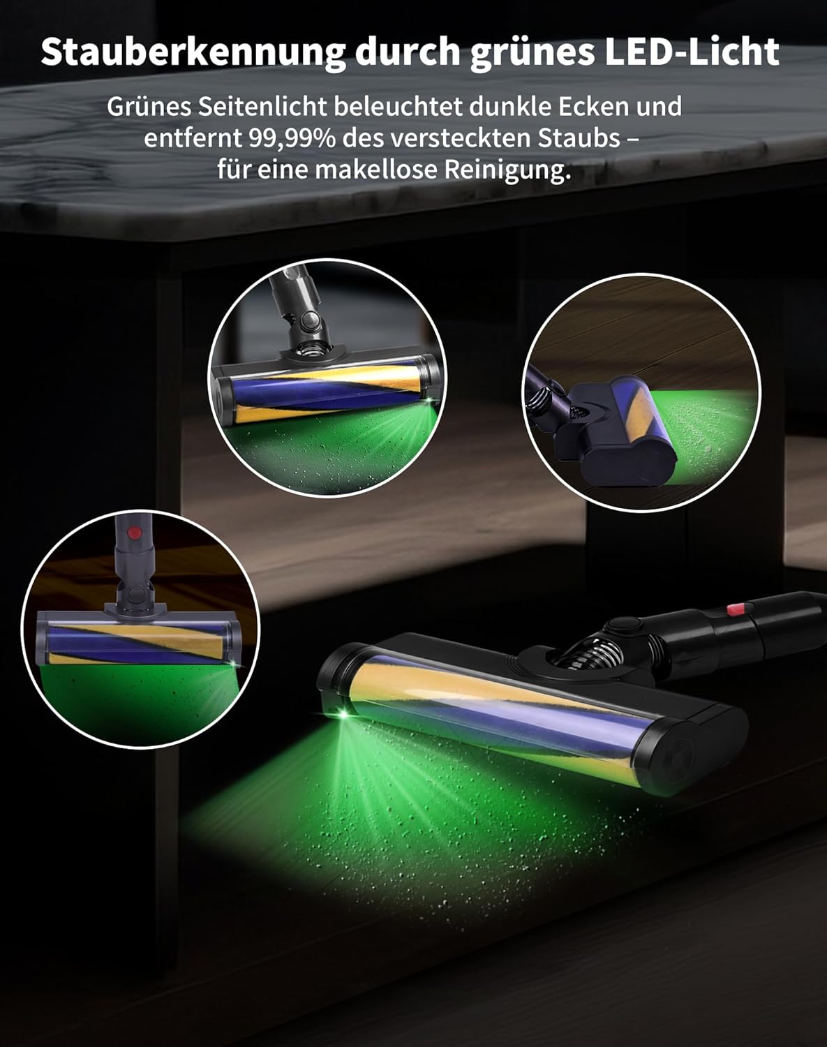 - Effiziente Stauberkennung für präzisere Reinigung: Die bodendüse verfügt über ein verbessertes LED-Grünlicht, das den Kontrast zwischen Staub, Haaren und dem Boden verstärkt. Dadurch werden selbst versteckte Verschmutzungen sichtbar – ideal für