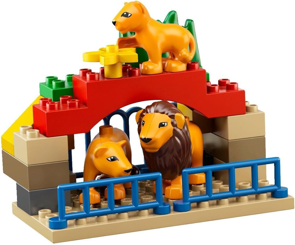 - Besteht aus Fahrzeug mit Anhänger, Mistgabel, Zooeingang, umzäunten Gehegen, Pinguin-Spielplatz mit Rutsche, Asien-Gehege und vielen weiteren Duplo Steinen, um unterschiedliche Tiergehege zu bauen