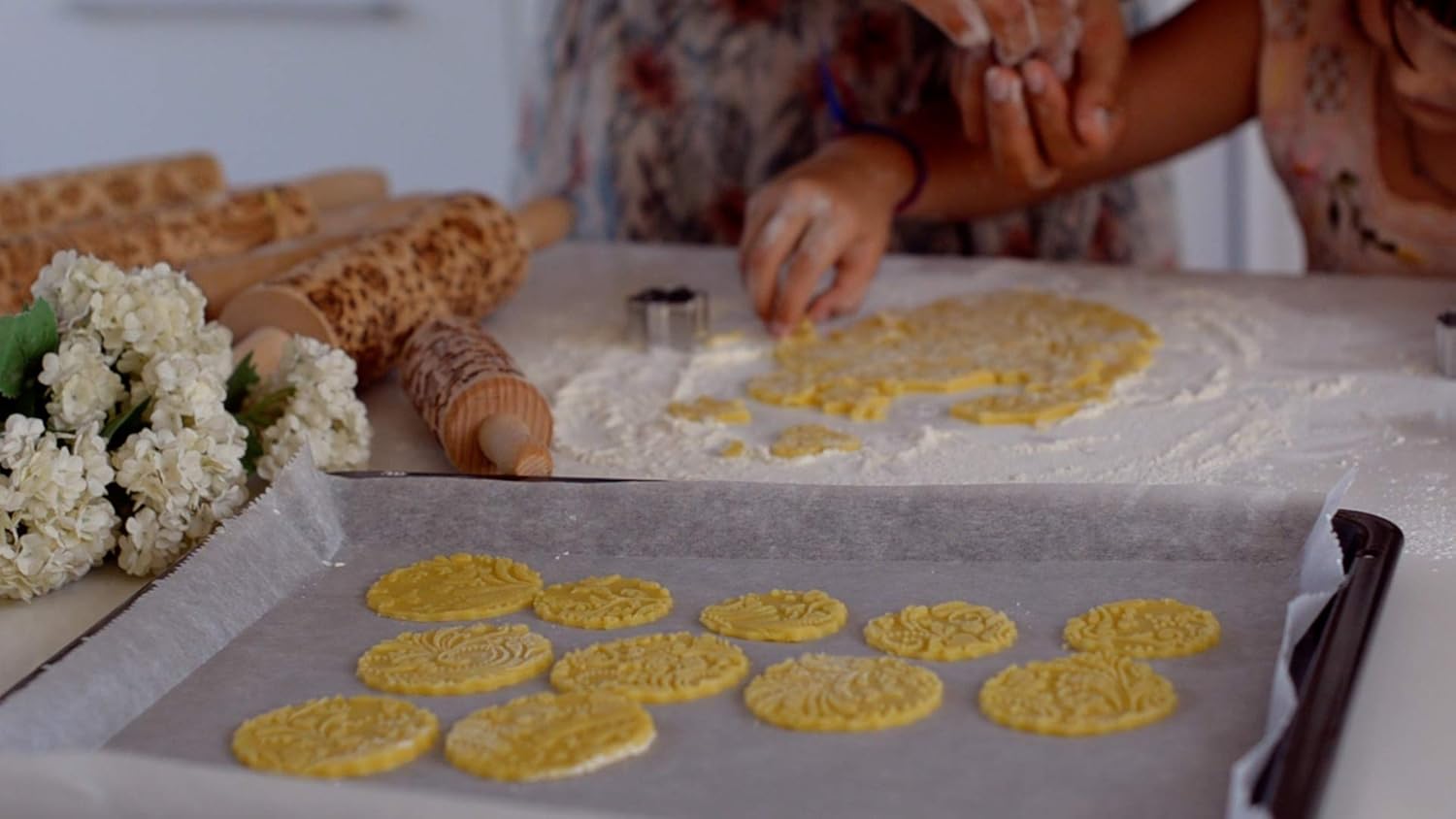 - Rollen Sie den Teig zuerst mit einem klassischen Nudelholz aus, anschliessend prägen Sie das Muster mit dem Prägenudelholz und stanzen oder schneiden dann die Kekse aus.