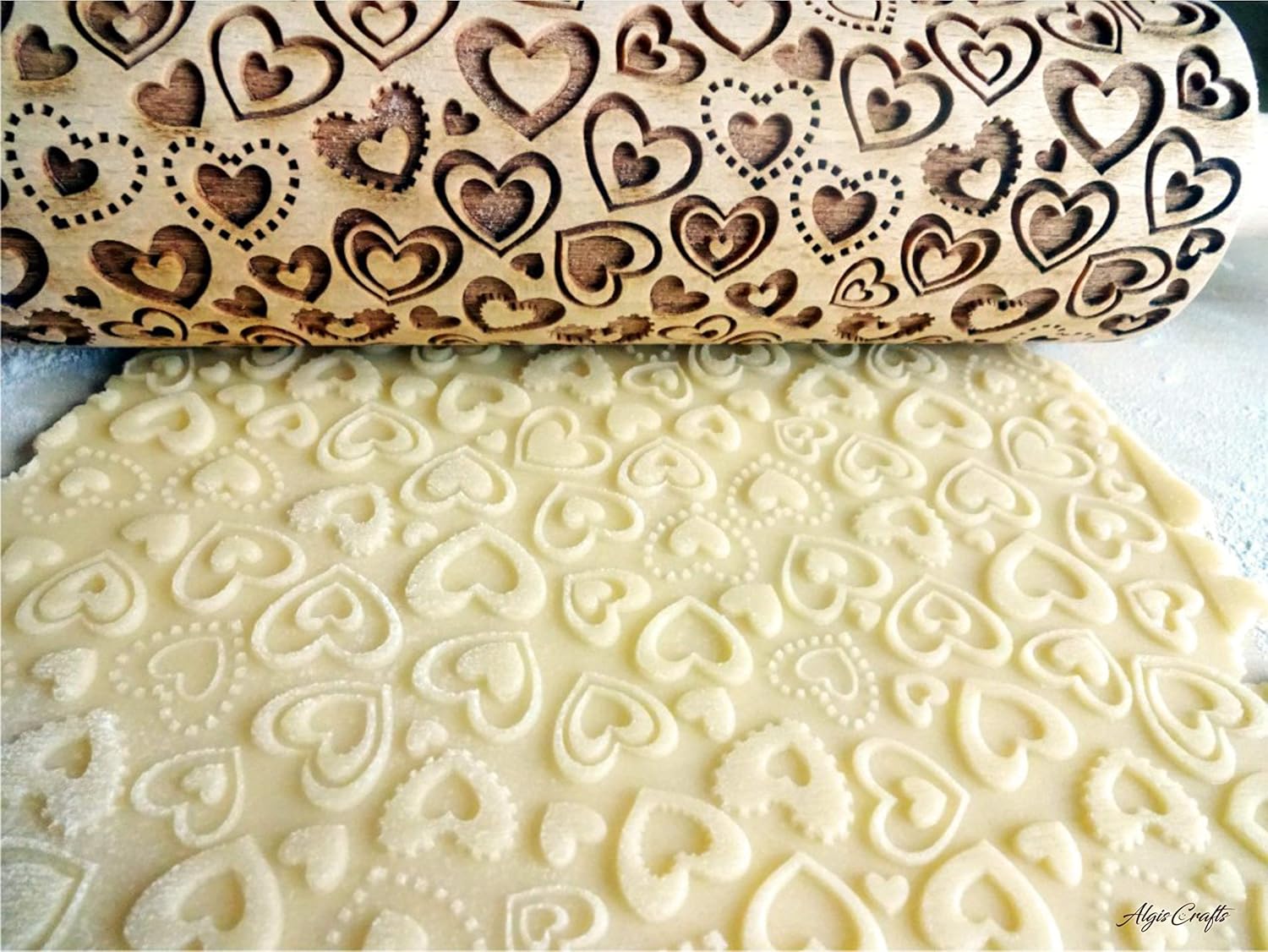 - Die Lasergravur wird auf dem Nudelholz angebracht und hinterlässt einen deutlichen Abdruck auf dem bearbeiteten Teig.