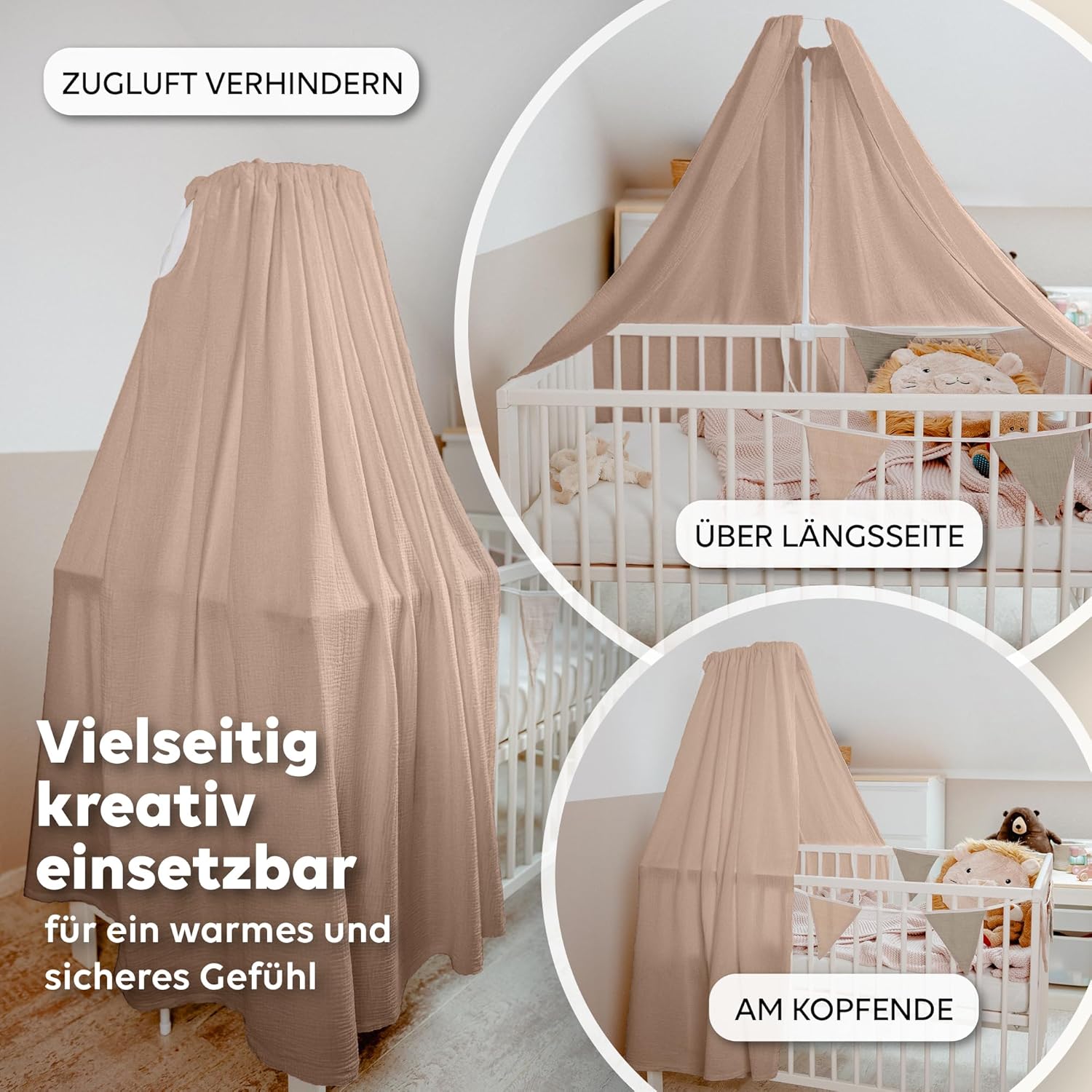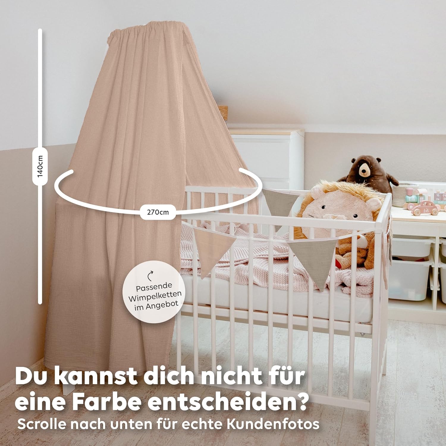- ✨ 100% MUSSELIN BAUMWOLLE - Unser handgenähter Betthimmel besteht aus hochwertigem Baumwoll Stoff, der weich und atmungsaktiv ist. Perfekt für eine kuschelige & beruhigende Schlafumgebung im Babyzimmer.