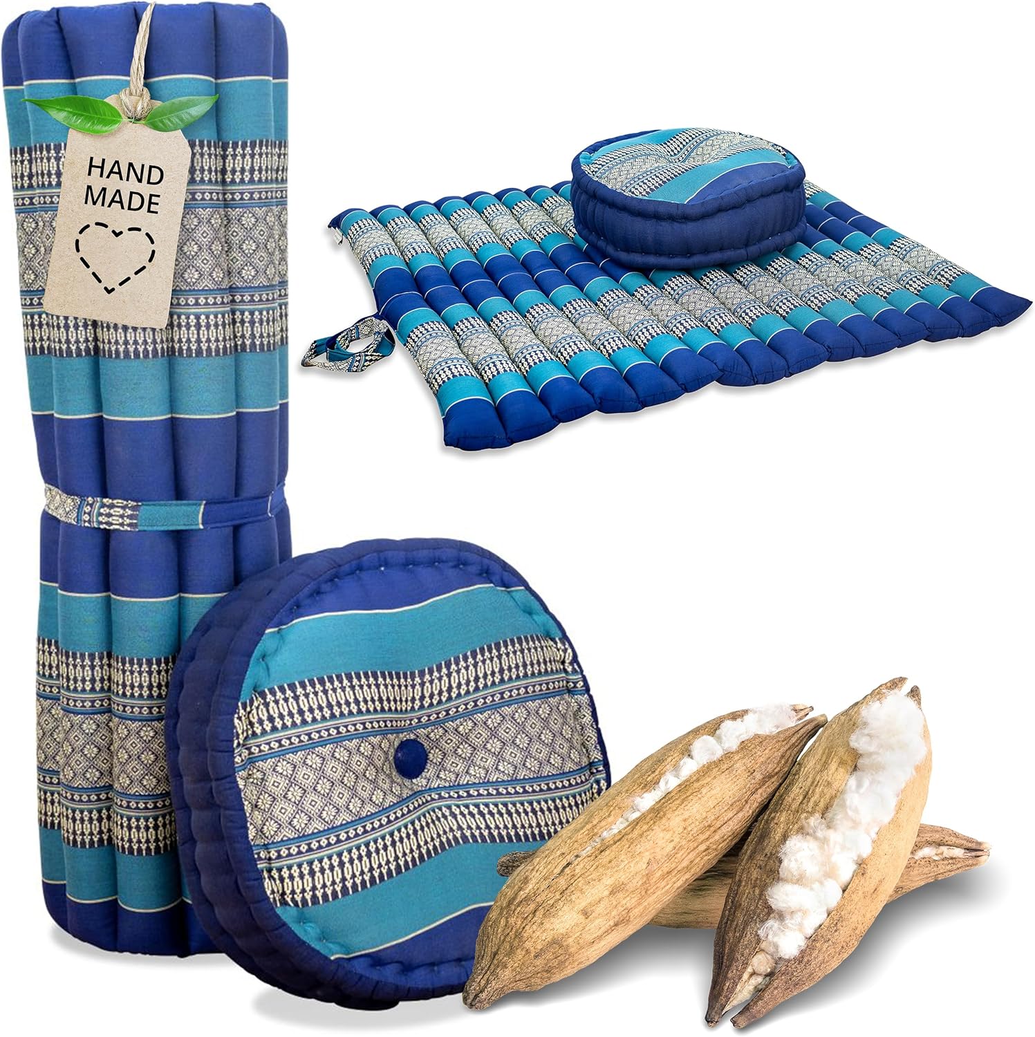 - PRAKTISCH UND VIELSEITIG: Das Set eignet sich für Yoga und Meditation sowie als moderne Alternative zu Gartenstühlen, Esszimmerstühlen und Balkonmöbeln. Das Set aus Rollmatte und Kissen ist gefüllt mit Kapok, der Pflanzen-Daune – so bringst du