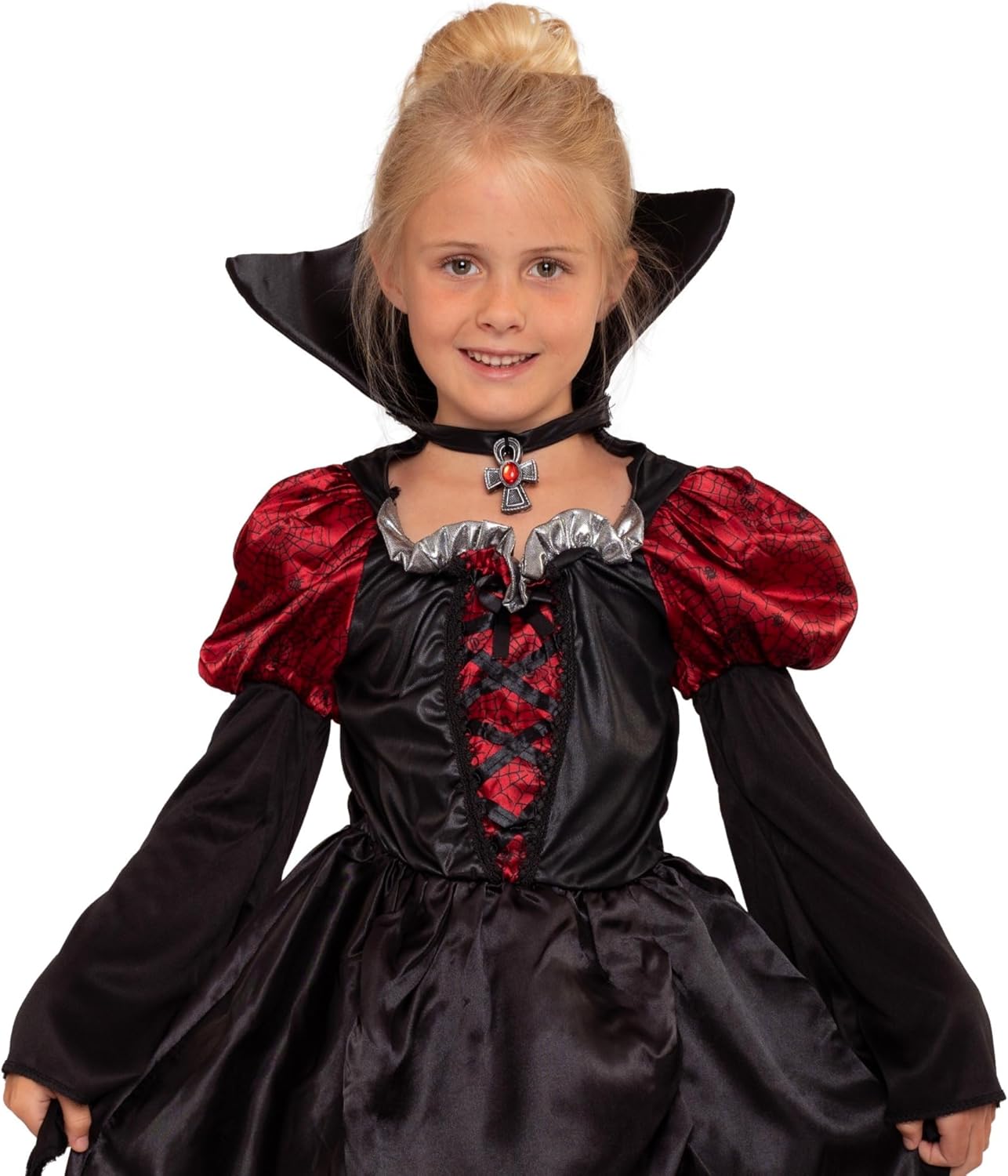 - Edel & hochwertig: Dieses Vampirin-Kostüm besteht aus einem langen Kleid in Schwarz und Dunkelrot aus hochwertigem Stoff. Der angenähte Kragen mit Medaille sitzt stabil und verrutscht nicht