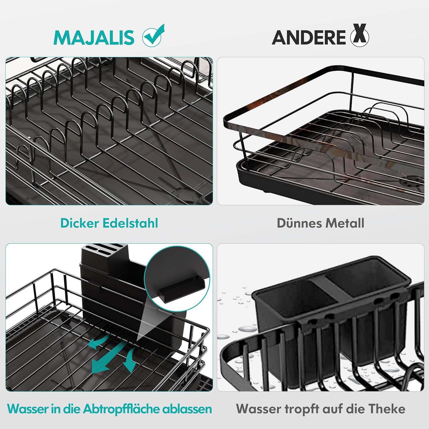 - Grosses Fassungsvermögen: Der MAJALIS Abtropfständer für die Spüle verfügt über ein grosses Fassungsvermögen von 41,9 L x 33 B x 15,2 H cm (16,5 L x 13 B x 6 H), wodurch er Geschirr und Besteck unterschiedlicher Grösse aufnehmen kann. Es bietet