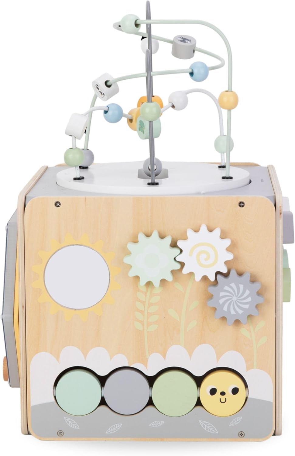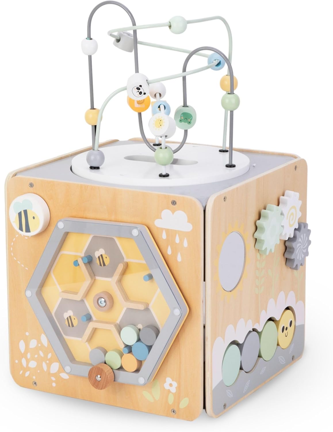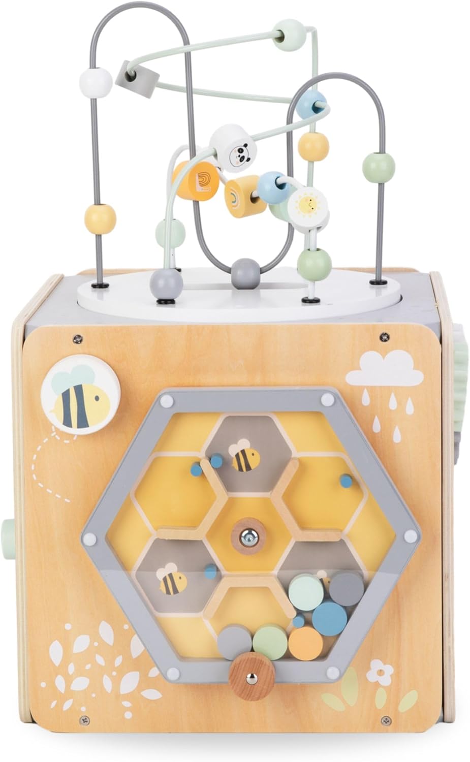 - Entdecke den vielseitigen Motorikwürfel für dein Baby: Der Activity Würfel bietet einen Formensortierer mit 6 Formen, Holzperlen-Motorschleife, Baumförmiges Labyrinth, Spiegel, rotierende Kreise und ein Klick-Spiel mit einer niedlichen Biene