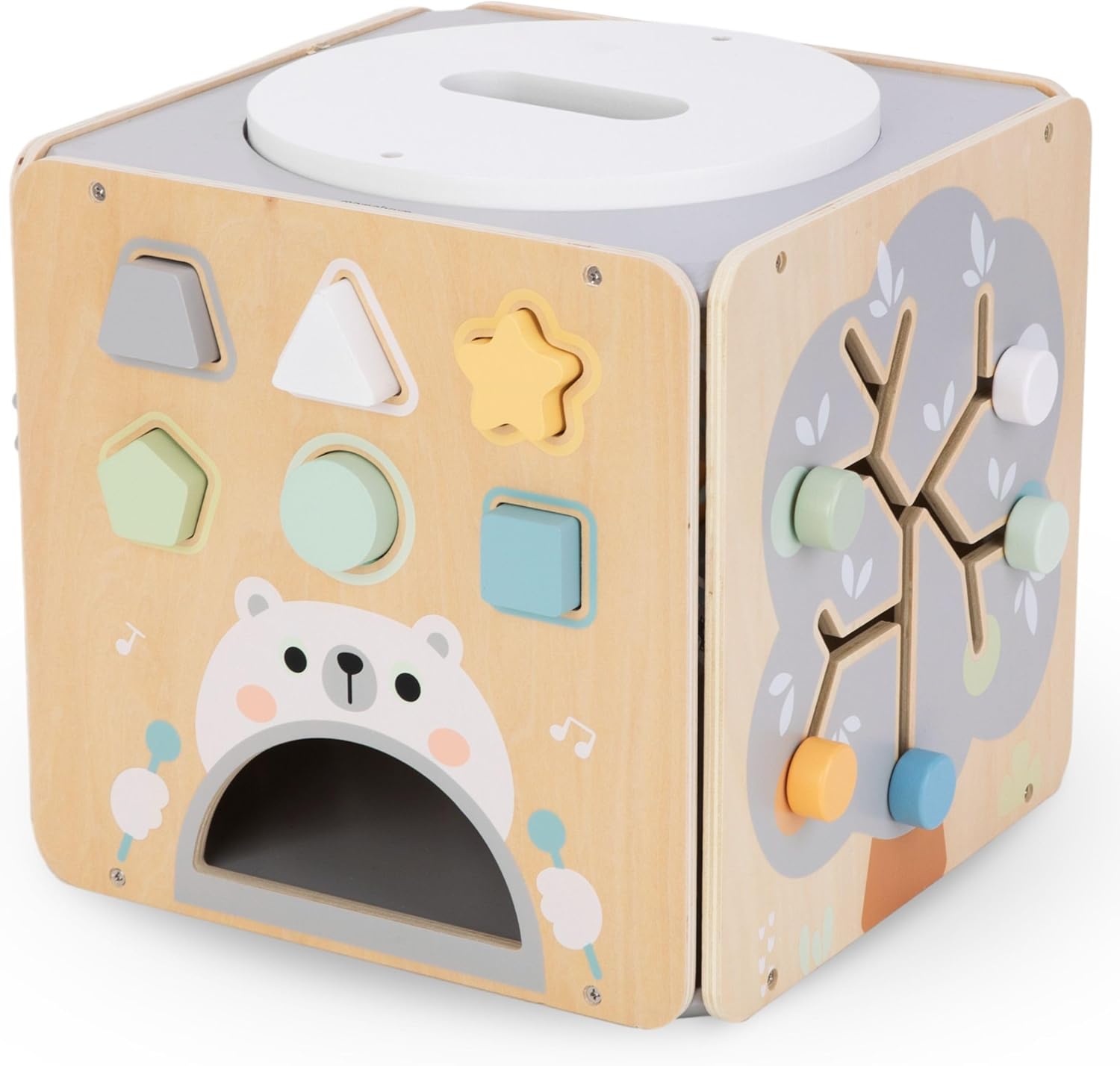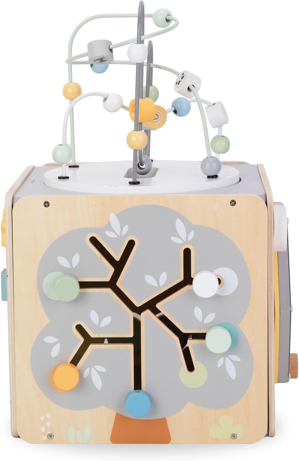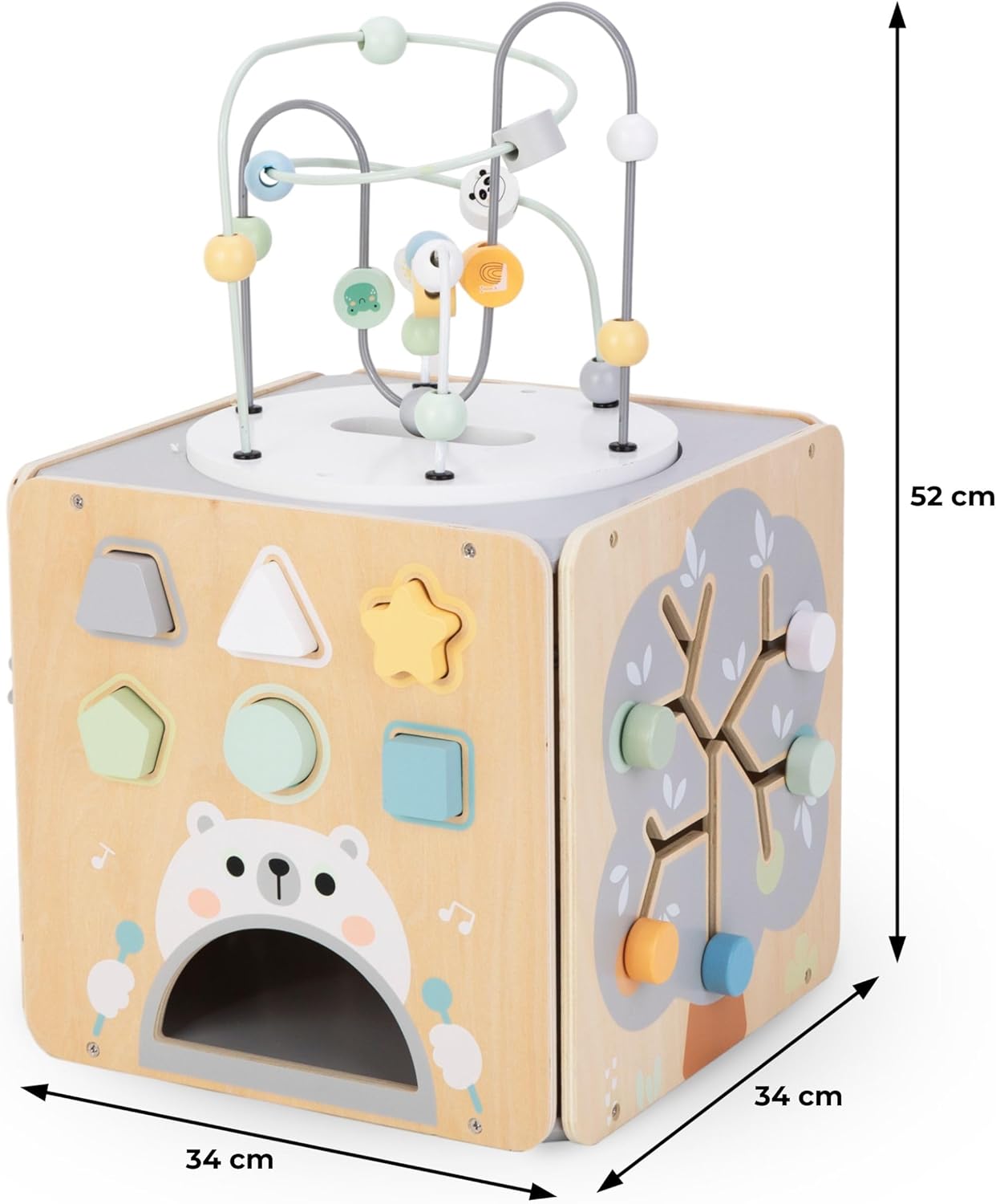 - Entdecke den vielseitigen Motorikwürfel für dein Baby: Der Activity Würfel bietet einen Formensortierer mit 6 Formen, Holzperlen-Motorschleife, Baumförmiges Labyrinth, Spiegel, rotierende Kreise und ein Klick-Spiel mit einer niedlichen Biene