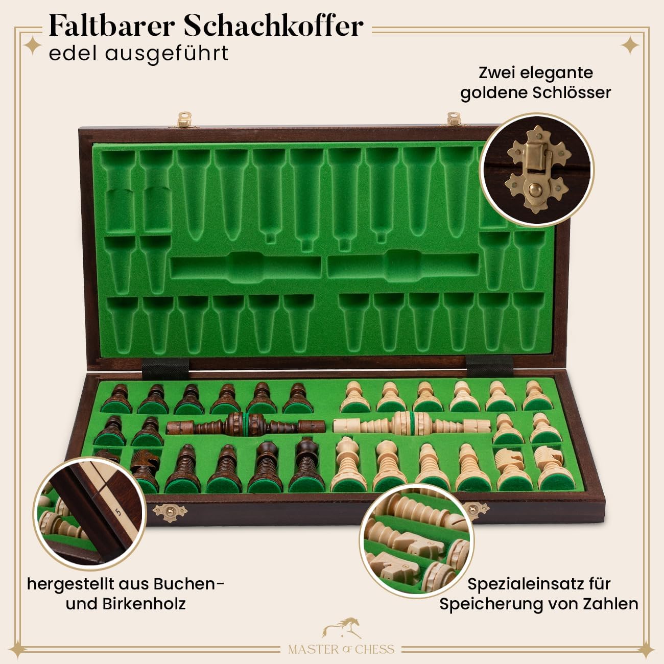 - Diese schönen Schachfiguren im Gentelman-Stil sind aus Weissbuchenholz. Dieses Set beinhaltet ein faltbares Schachbrett, Grösse 48x24x6cm, mit einem Einsatz für Figuren im Inneren.