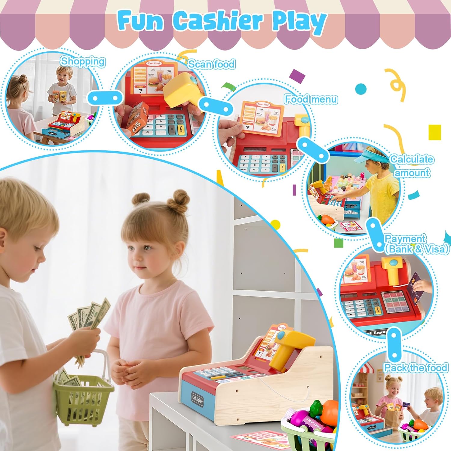 - đ§șă40+ Teile Premium-SetăElektrische spielzeugkasse enthĂ€lt: 1 Scanner mit Licht/Sound, 1 Einkaufskorb, 16 Geldscheine + 12 MĂŒnzen, 2 Snackboxen, Kredit-/Visakarten, 2 Speisekarten, Lebensmittelmodelle (GemĂŒse, Brot, Fisch) und GetrĂ€nke. Der