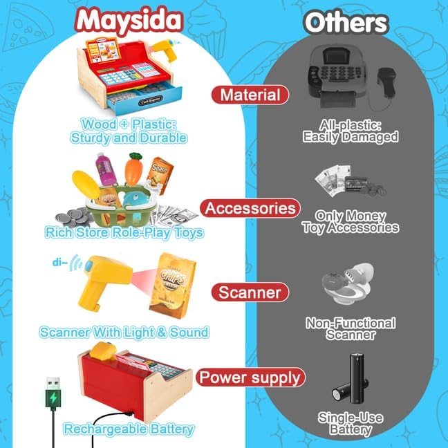 - đȘ”ăMeisterhaftes Holz-KinderkasseăMaysida Upgrade-Version des Holz-Kassenspiels bricht mit traditionellem Design und kombiniert hochwertiges Holz mit rot-blauer PVC-Optik â stylisch und verspielt. Neben einem echten Taschenrechner verfĂŒgt es