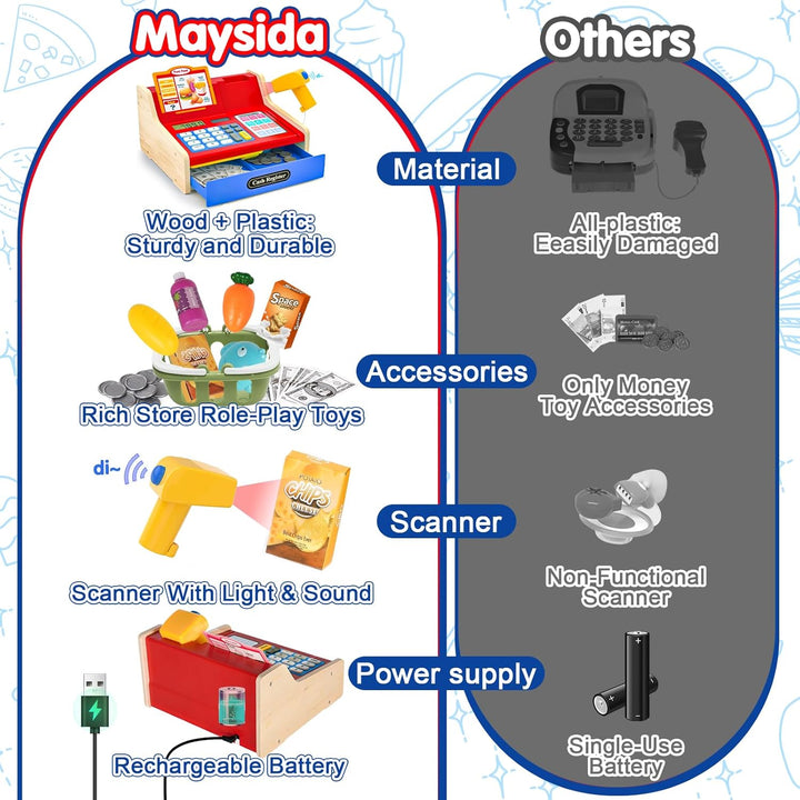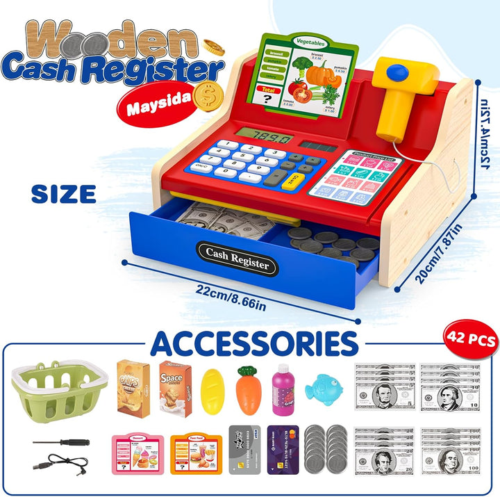 - đȘ”ăMeisterhaftes Holz-KinderkasseăMaysida Upgrade-Version des Holz-Kassenspiels bricht mit traditionellem Design und kombiniert hochwertiges Holz mit rot-blauer PVC-Optik â stylisch und verspielt. Neben einem echten Taschenrechner verfĂŒgt es