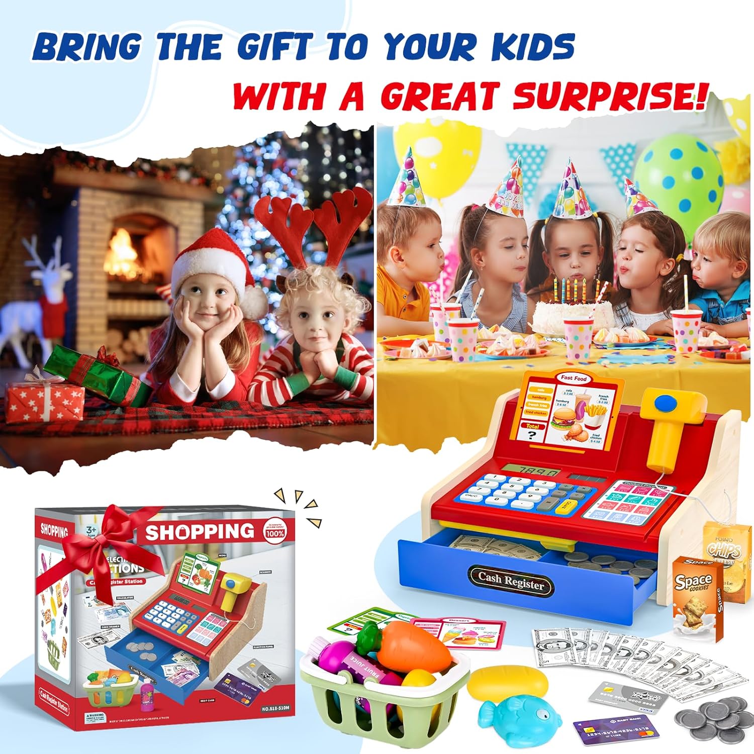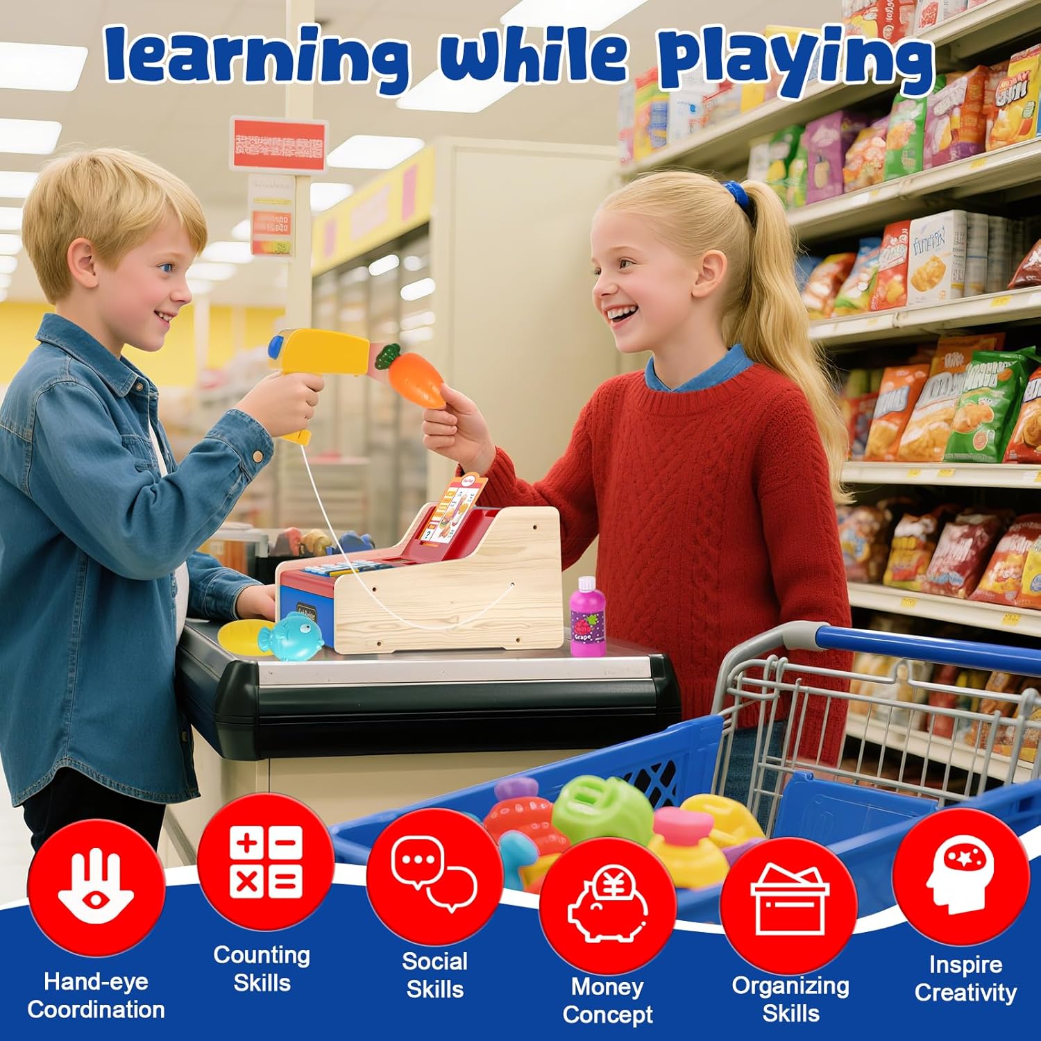 - đ§șă40+ Teile Premium-SetăElektrische spielzeugkasse enthĂ€lt: 1 Scanner mit Licht/Sound, 1 Einkaufskorb, 16 Geldscheine + 12 MĂŒnzen, 2 Snackboxen, Kredit-/Visakarten, 2 Speisekarten, Lebensmittelmodelle (GemĂŒse, Brot, Fisch) und GetrĂ€nke. Der