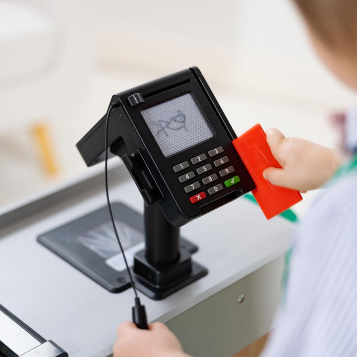 - INTERAKTIVES SPIELERLEBNIS: Robuster, freistehender Einkaufsladen aus Holz mit realistischen Funktionen wie einem piependen „Scanner“ und einem Kassenband mit Handkurbel für endlosen Spielspass