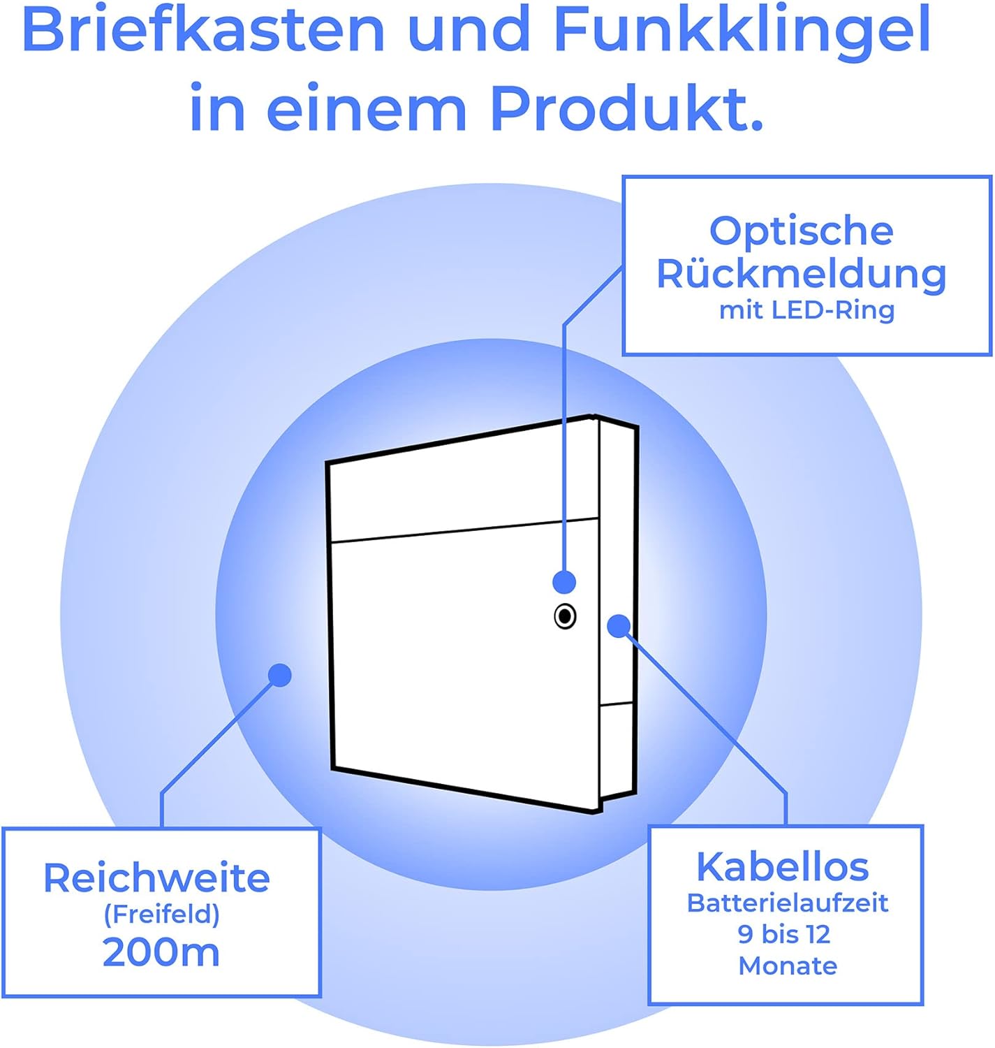 - Kombiniert das Beste aus 2 Welten: Funktürklingel und Briefkasten in einem innovativen Produkt, Mit dieser hochwertigen und intelligenten Lösung heben Sie sich stilvoll von Ihren Nachbarn ab und sorgen für einen echten Hingucker in Ihrem
