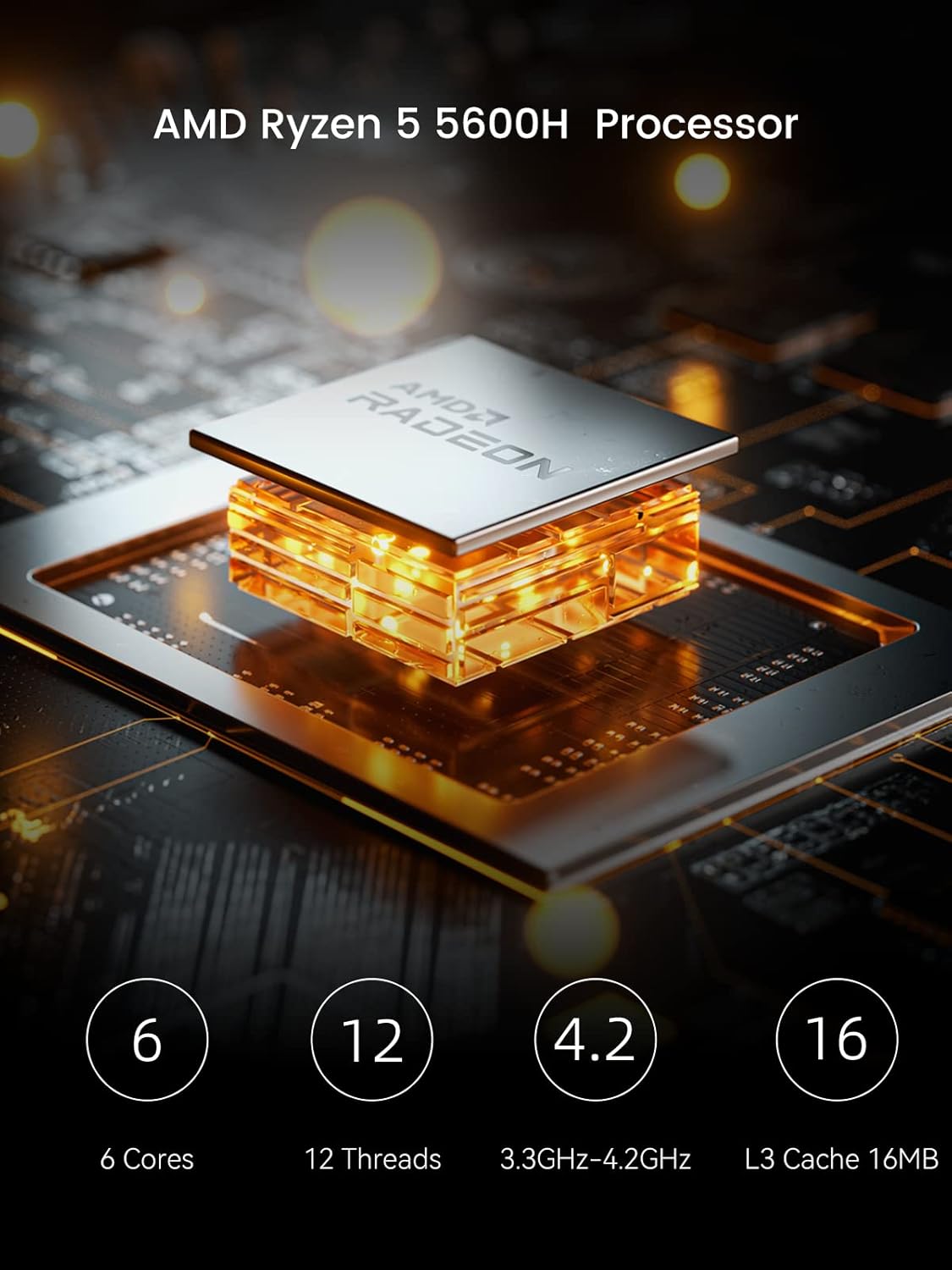 - 【Hohe Leistung】Angetrieben von einem AMD Ryzen 5 5600H-Prozessor mit AMD Radeon-Grafik (1800 MHz Grafikfrequenz). 6 Kerne/12 Threads, 3 MB L2-Cache insgesamt, 16 MB L3-Cache insgesamt, bis zu 4,2 GHz. Das MINISFORUM UM560XT bewältigt problemlos