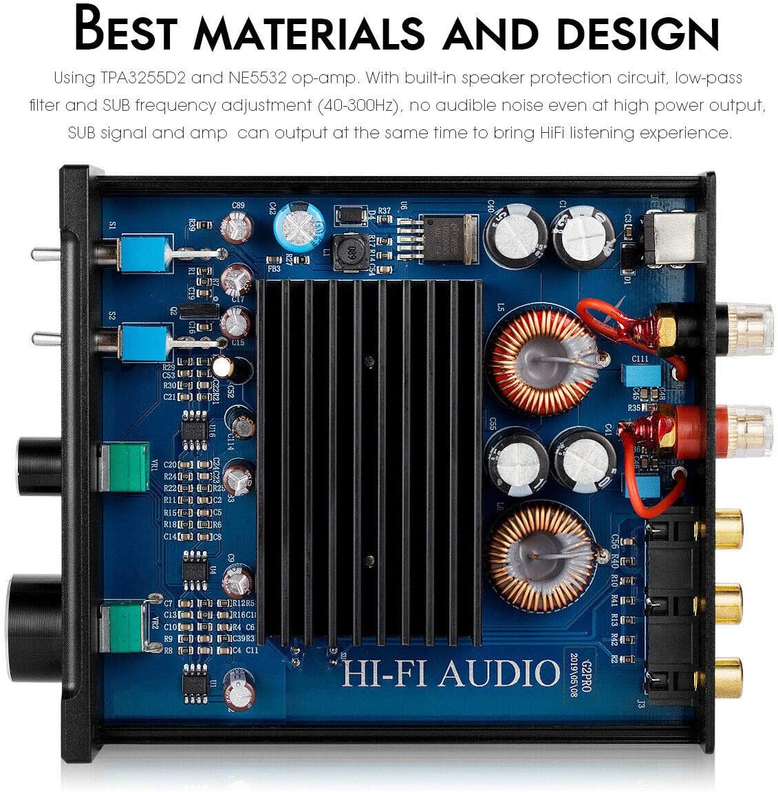 - Maximale Ausgangsleistung von 300W: mit TPA3255D2 Verstärkerchip und ausgestattet mit einem 32 V / 5 A grossen Netzteil, das ausreicht, um passive 320-W-Lautsprecher oder Subwoofer anzutreiben. Es passt auch gut zu