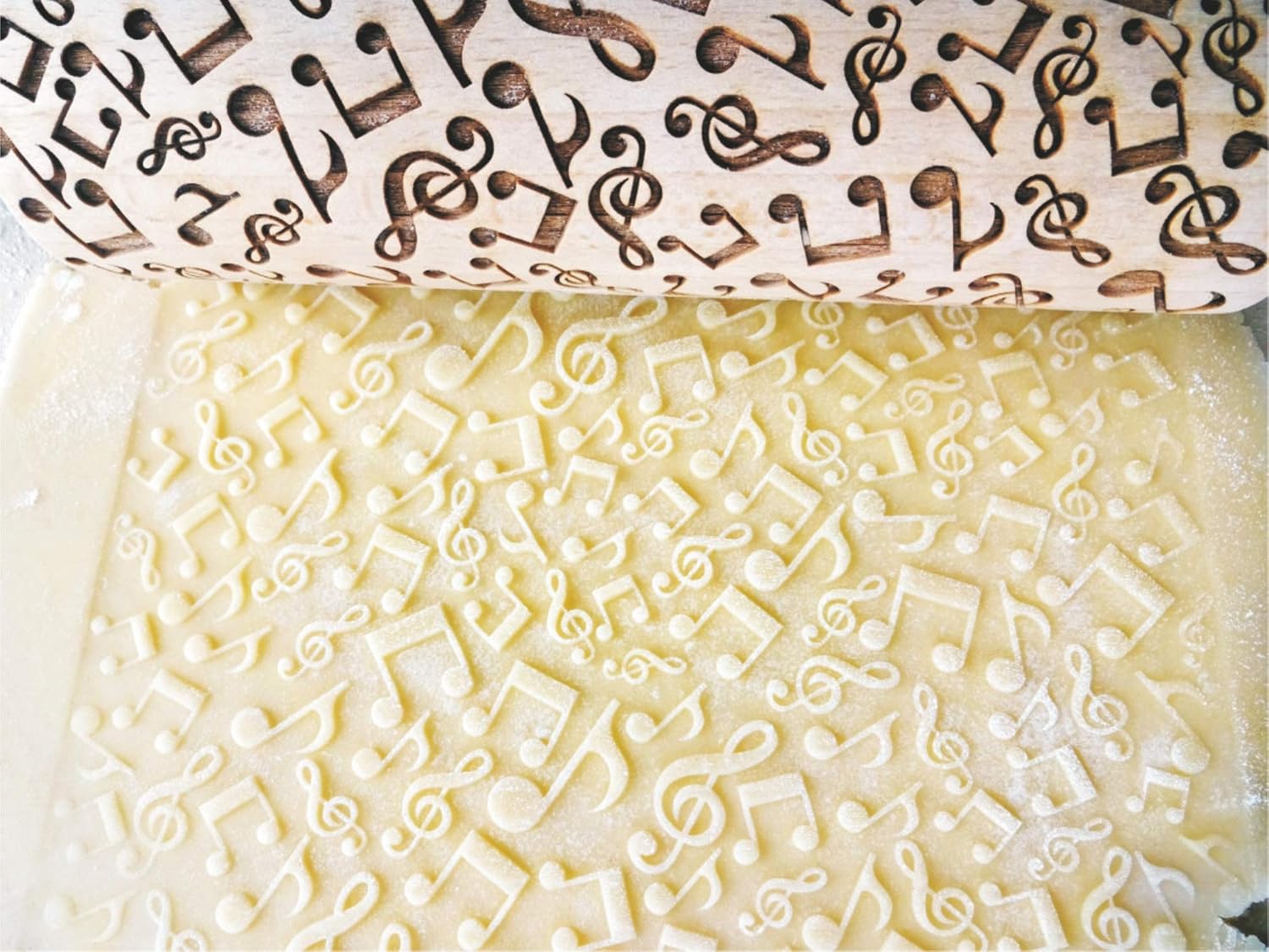 - Die Lasergravur wird auf dem Nudelholz angebracht und hinterlässt einen deutlichen Abdruck auf dem bearbeiteten Teig.