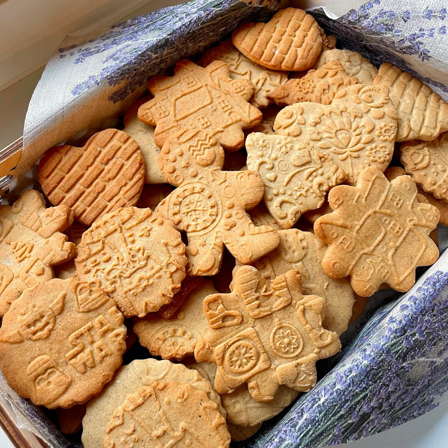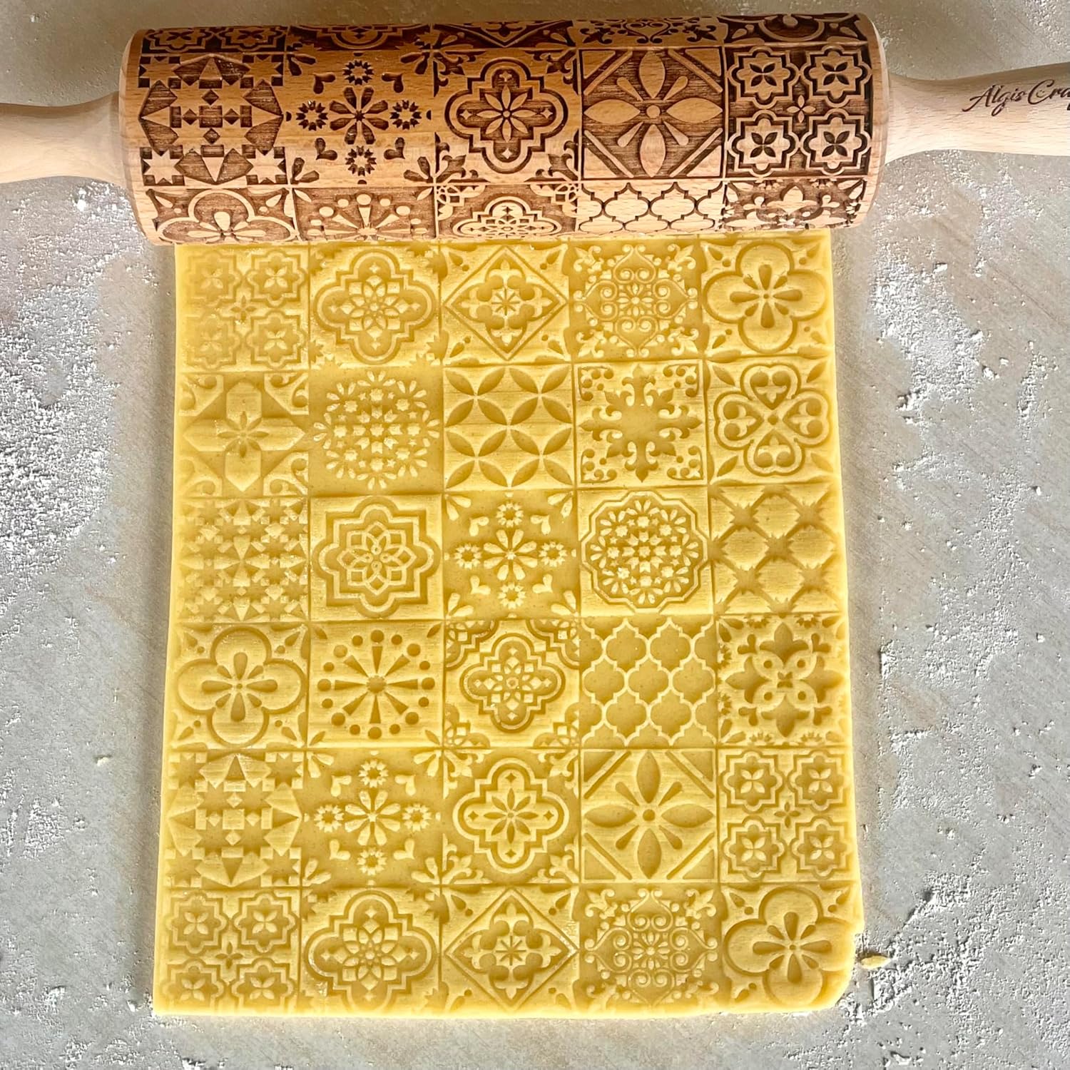 - Rollen Sie den Teig zuerst mit einem klassischen Nudelholz aus, anschliessend prägen Sie das Muster mit dem Prägenudelholz und stanzen oder schneiden dann die Kekse aus.