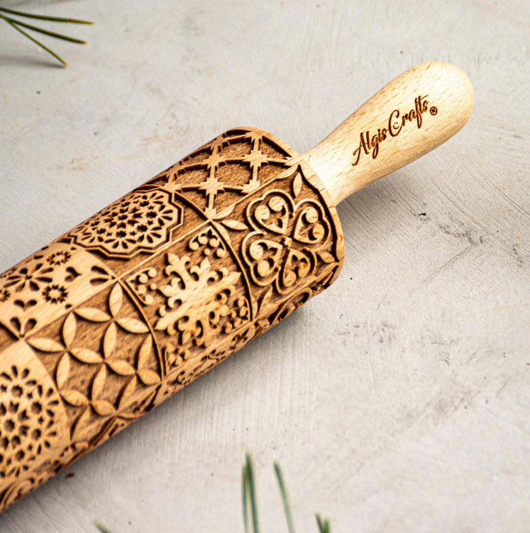 - Die Lasergravur wird auf dem Nudelholz angebracht und hinterlässt einen deutlichen Abdruck auf dem bearbeiteten Teig.
