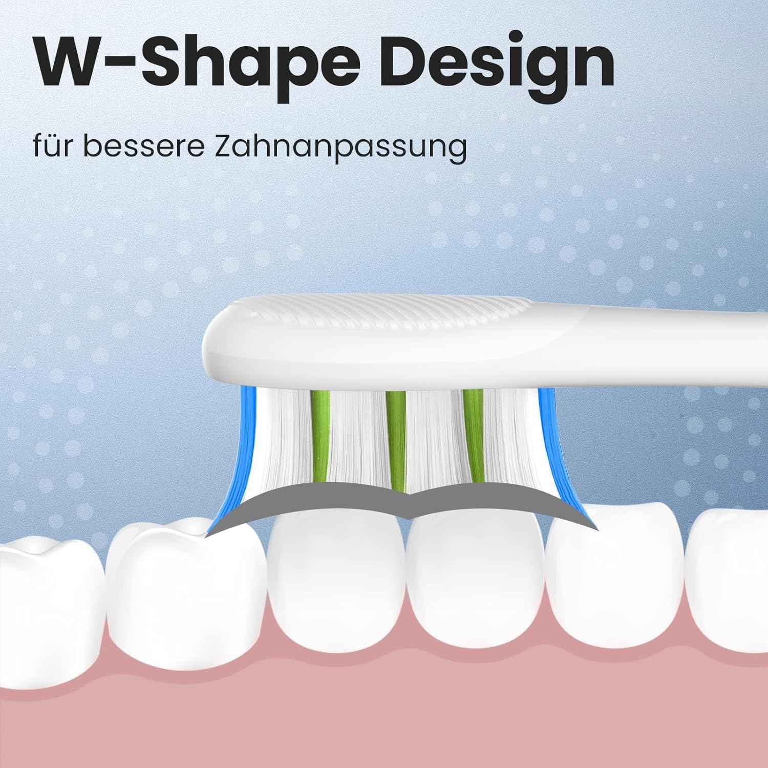 - Sorgfältiges Borstendesign: Das W-förmige langen und kurzen Borsten können sich nicht nur auf die Reinigung der Zahnzwischenräume konzentrieren, sondern bieten auch Zahnfleischschutz und Komfort. Feiner Zungenreiniger auf der Rückseite des