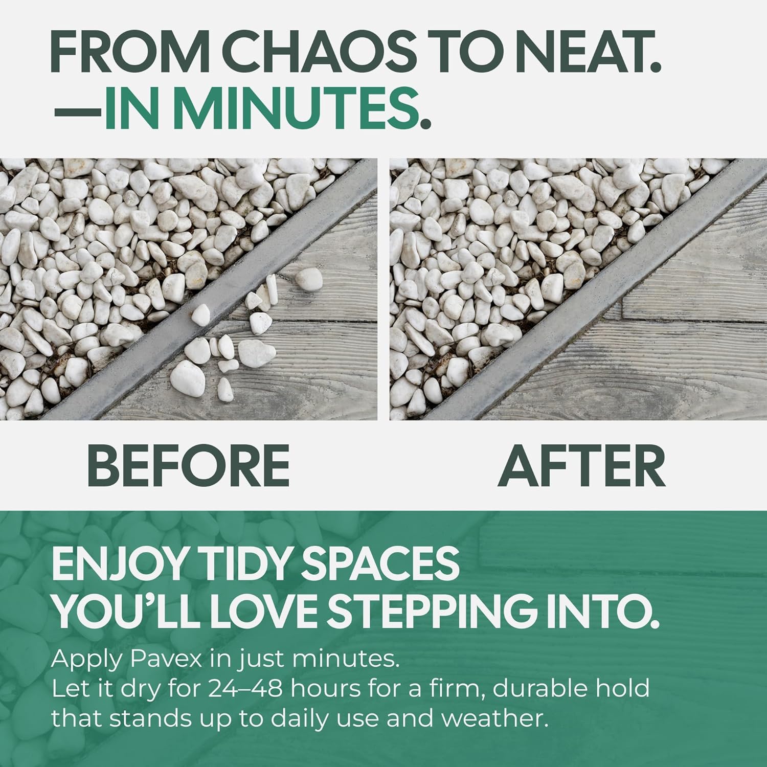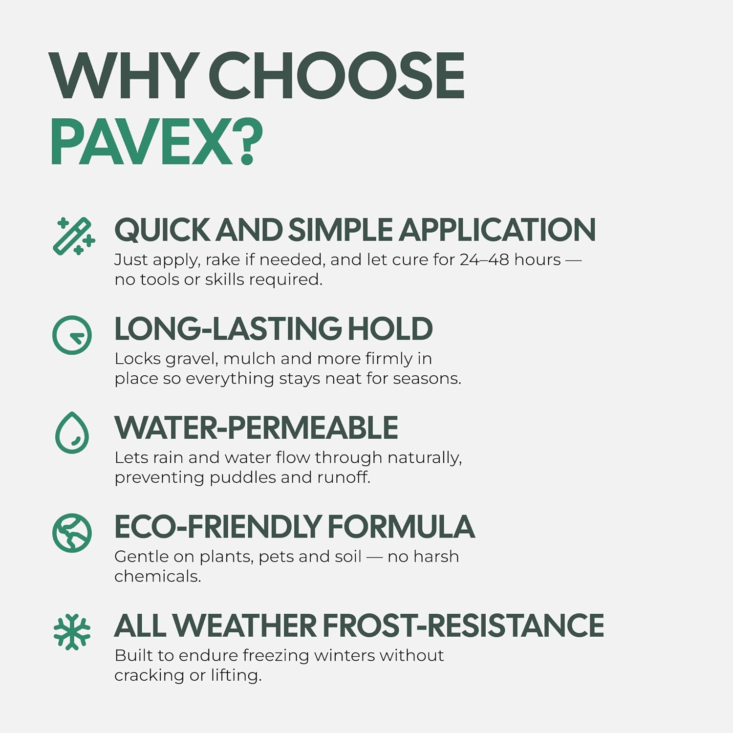 - PAVEX ein Bindemittel für lose Steine ist ein unschädliches, einfach zu verwendendes Produkt, das Steine aneinanderhaftend hinterlässt. Das Bindemittel wird empfohlen, um saubere Steine mit einem Durchmesser von 5 mm bis 18 mm an Ort und Stelle zu
