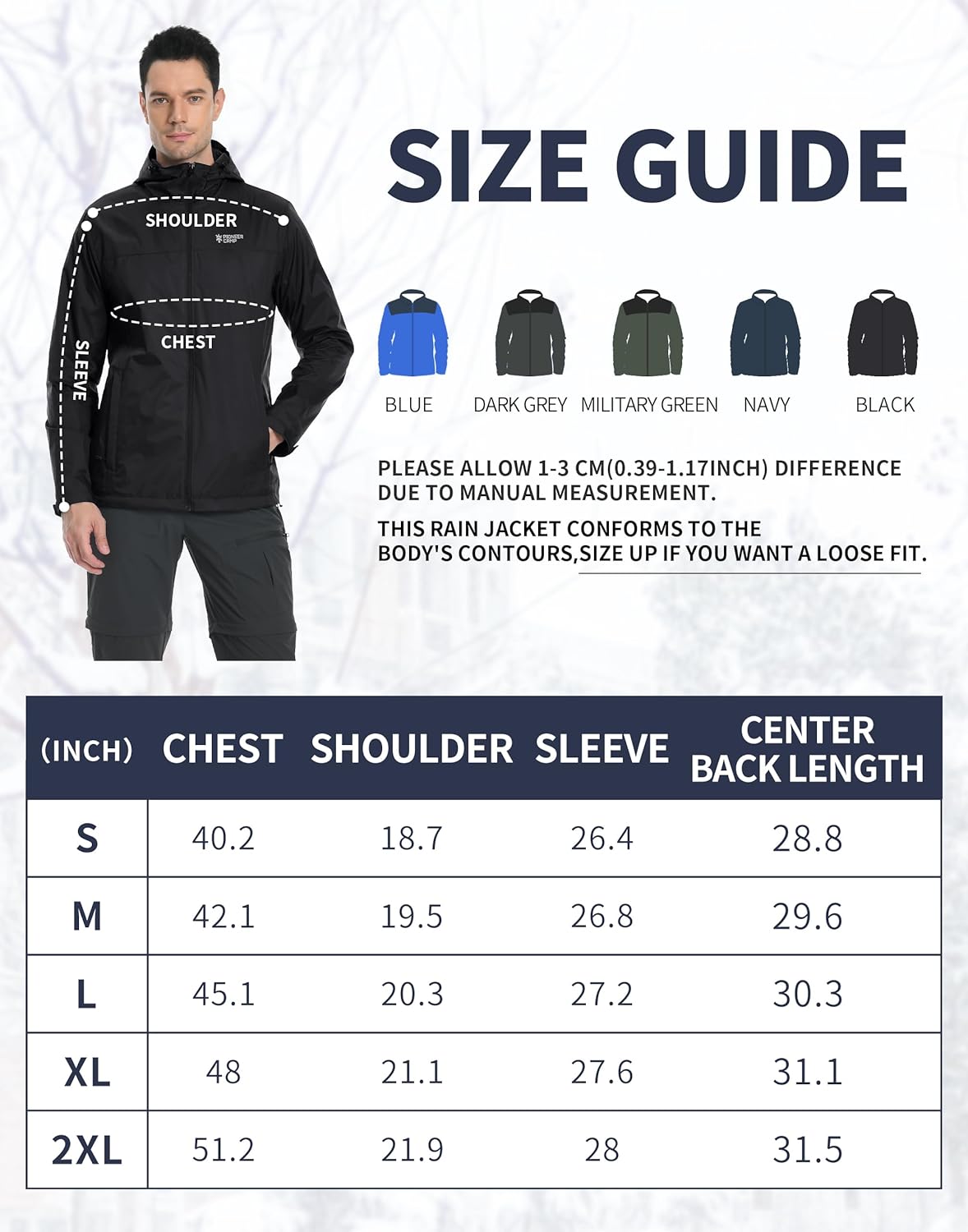 - 3 REISSVERSCHLUSS-TASCHEN & VERSTELLBAR:Die Herren Wasserdichte Regenjacke hat 2 Reissverschlusstaschen, tief genug für ein Smartphone, und 1 Innentasche mit Reissverschluss, um persönliche Dinge sicher aufzubewahren. Verstellbare Kapuze für