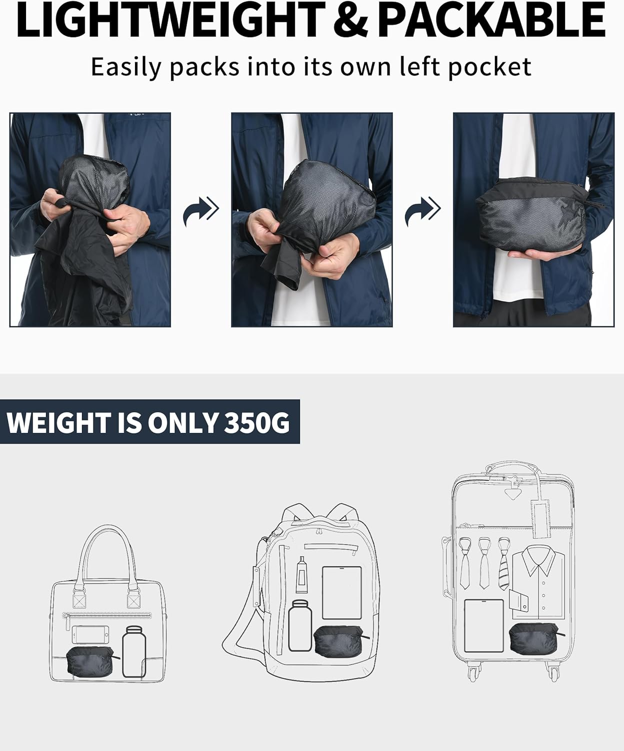 - LEICHT & PACKBAR: Diese Herren Regenjackem besteht aus Nylonmaterial für das ultimative Leichtgewicht;Das Gewicht beträgt nur 350 g. Sie kann problemlos in ihre eigene linke Seitentasche gepackt werden. Bequem und kompakt, um den Platzbedarf zu