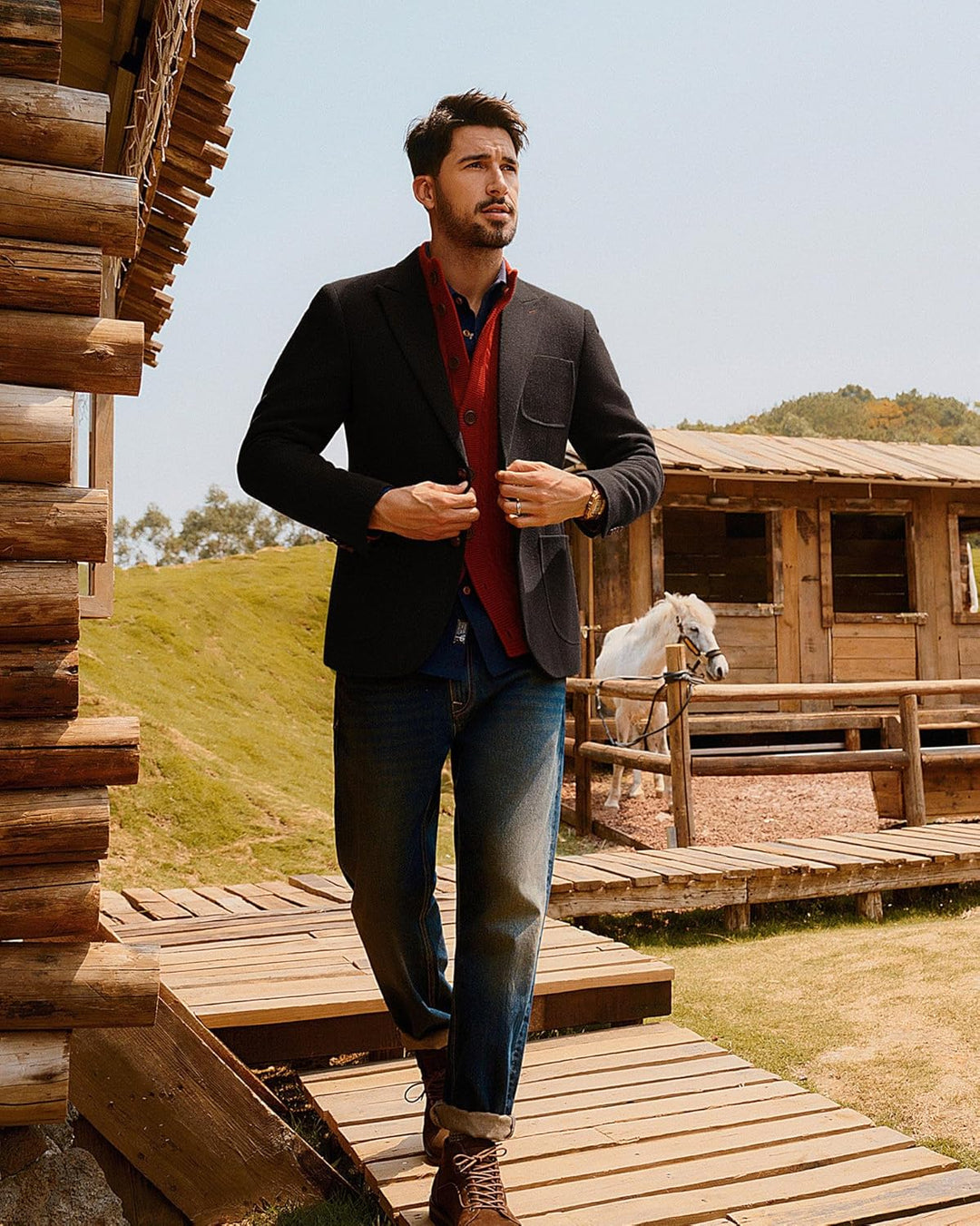 - Style Guide: Tragen Sie einen einfarbigen Rollkragenpullover unter einem regular fit Herrensakko, dazu eine dunkle Hose mit geradem Bein und Lederschuhe – für einen eleganten Retro-Winterlook. Alternativ können Sie ein kariertes Hemd mit zwei offenen
