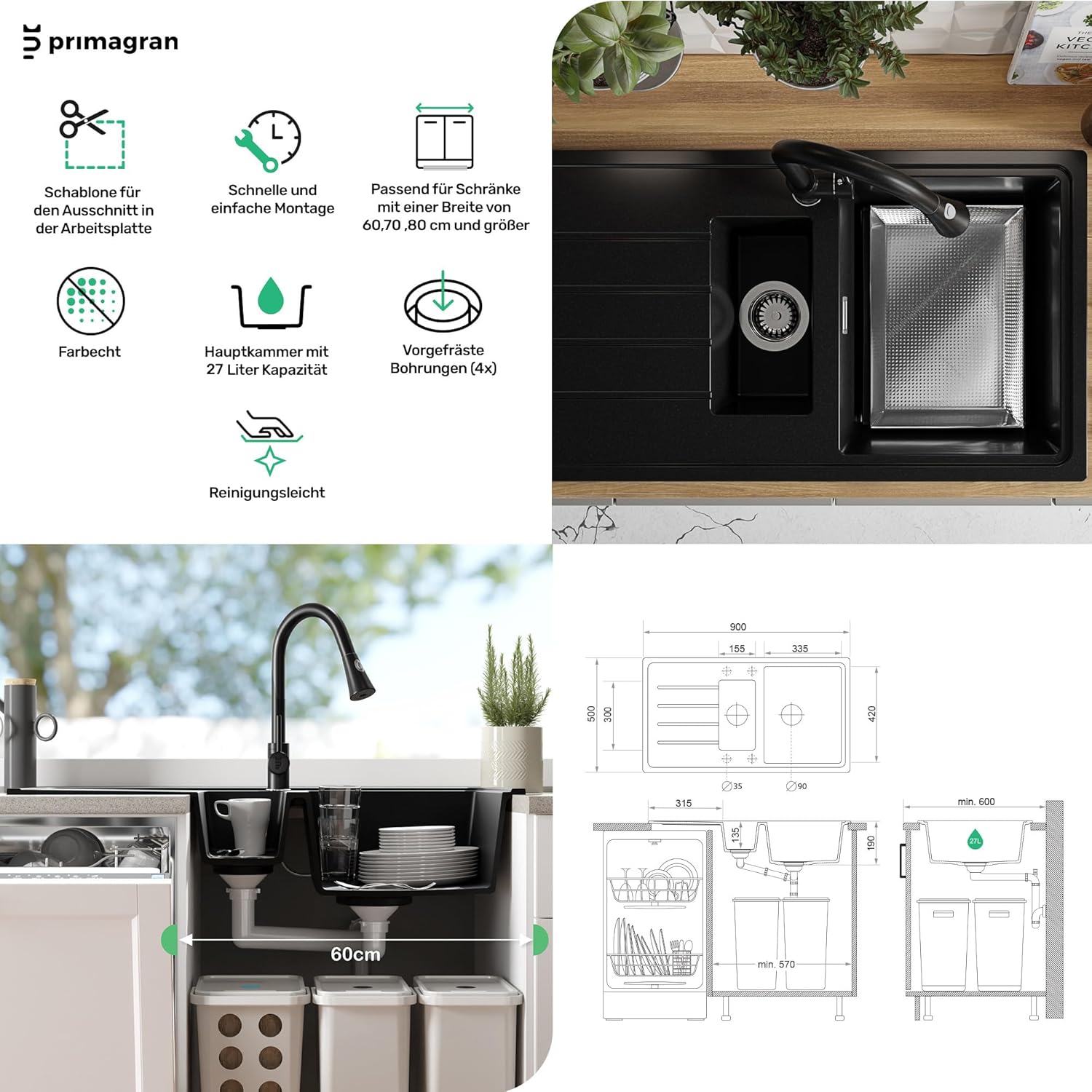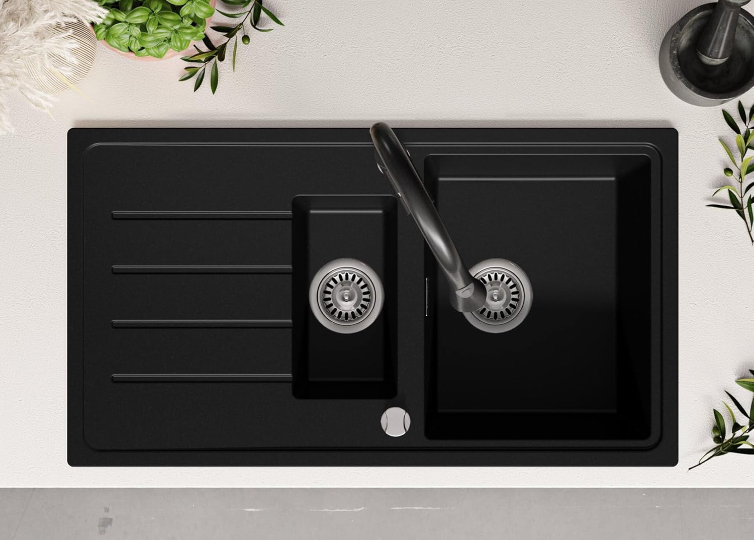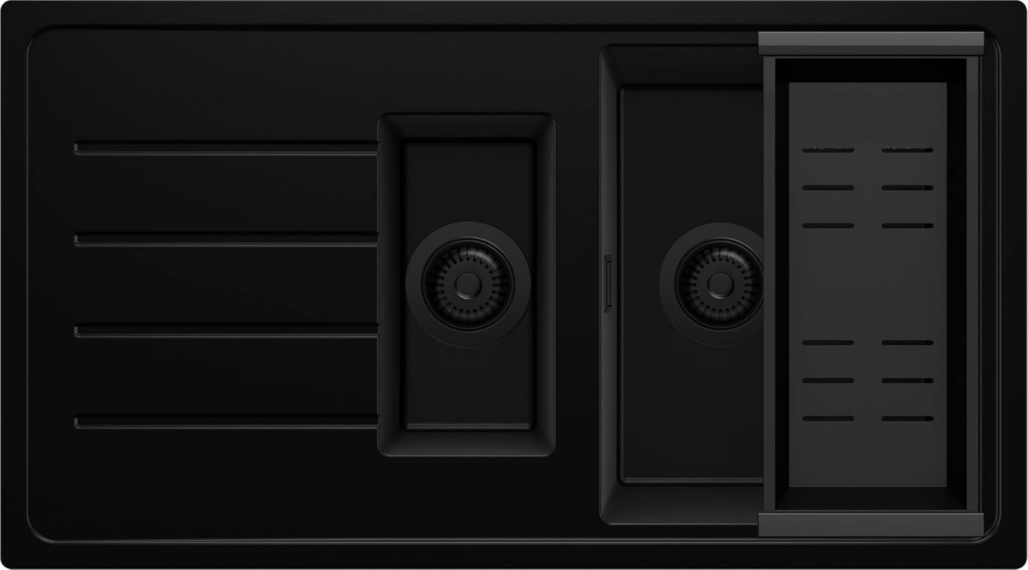 - 🔨 Im set - Spüle Kopenhagen 900-60 Duo, komplettes Abflusssystem (hochwertiger Siphon, Überlauf, zusätzlicher Abfluss für den Anschluss an Waschmaschine oder Geschirrspüler), Abtropfschale.