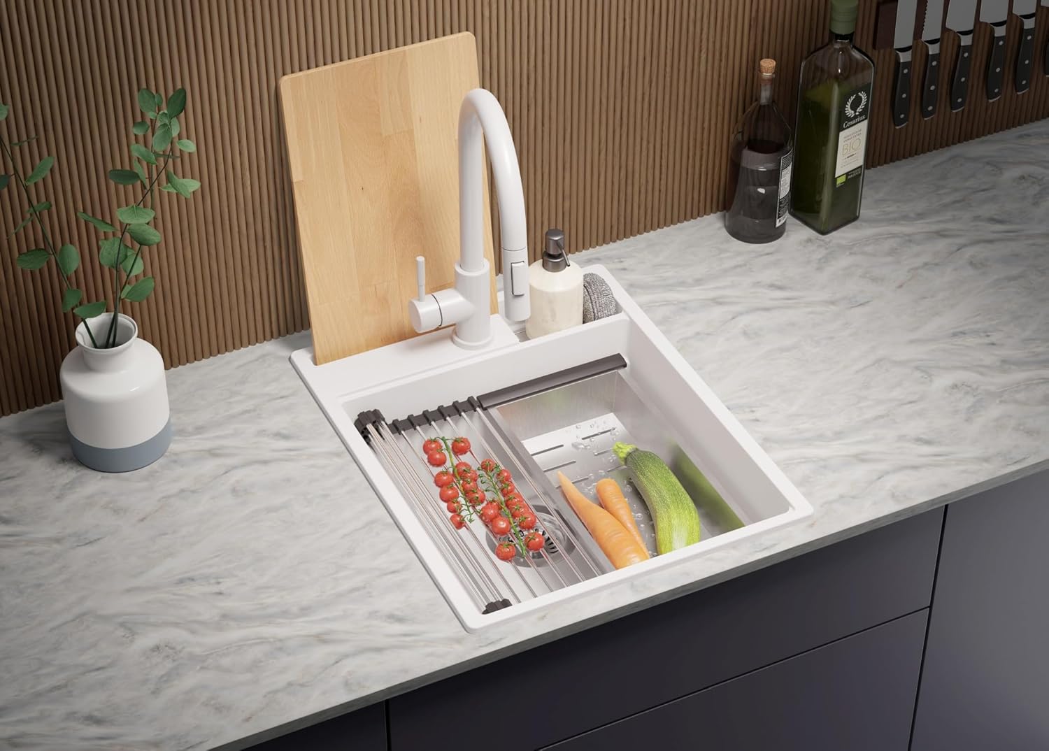 - 🛠️ MULTIFUNKTIONALE ARBEITSSTATION – Die Spüle verfügt über eine integrierte Kante, auf der dedizierte Zubehörteile wie eine aufrollbare Abtropffläche oder ein Schneidebrett platziert werden können. So können Sie gleichzeitig spülen,