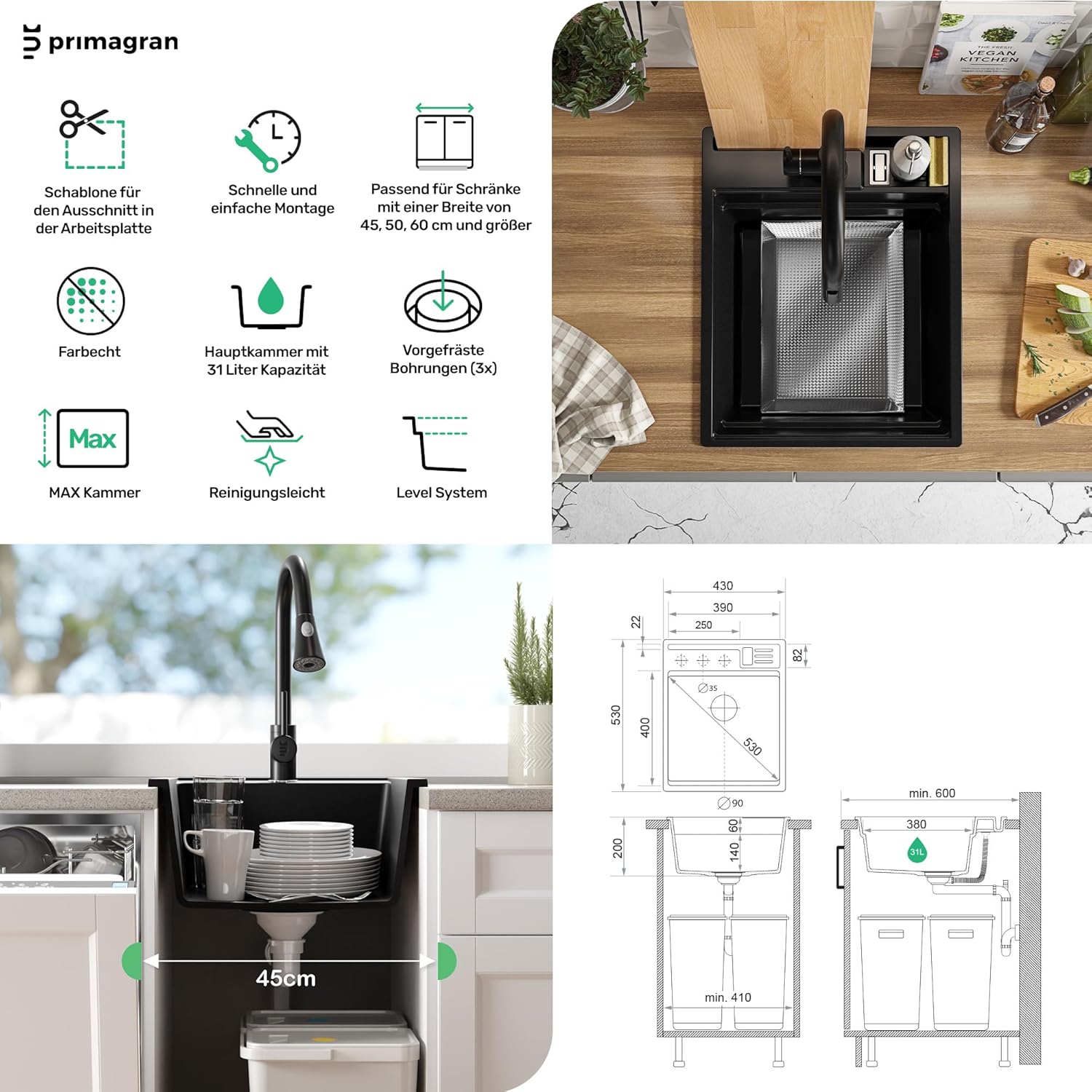 - 💎 WIDERSTANDSFÄHIGKEIT UND LANGLEBIGKEIT – Die Einbauspüle Oslo 45 Pocket Multilevel (RIGHT) mit den Massen 430x530x200 mm passt perfekt für Unterschränke ab 45 cm. Die Spüle ist schnell und einfach zu montieren, was Komfort und Zeitersparnis