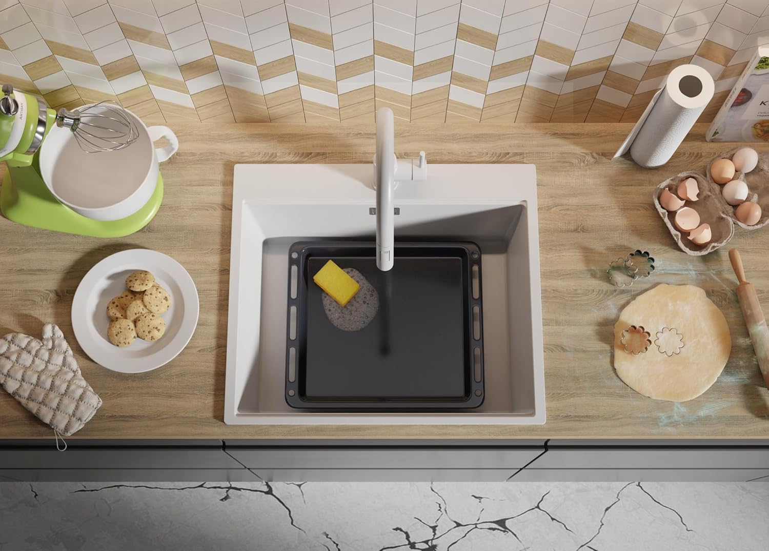 - 🛠️ VIELSEITIGE ARBEITSSTATION - Das Spülbecken verfügt über eine spezielle Kante, auf der Sie zusätzliches Zubehör wie eine aufrollbare Abtropffläche oder eine Abtropfschale platzieren können. Sie können gleichzeitig Produkte waschen und