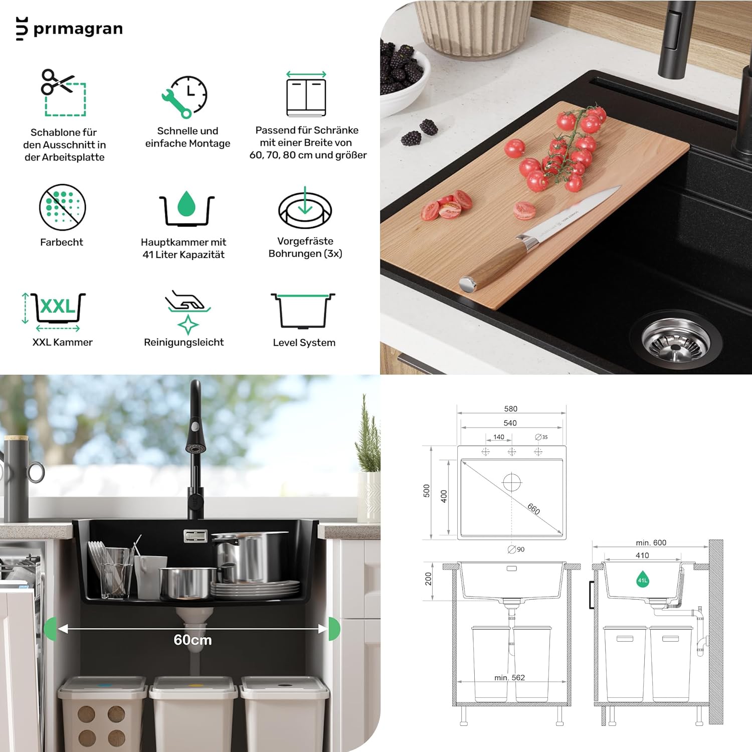 - 🔨 Im set - Spüle Oslo 60 Top, komplettes Abflusssystem (hochwertiger Siphon, Überlauf, zusätzlicher Abfluss für den Anschluss an Waschmaschine oder Geschirrspüler).