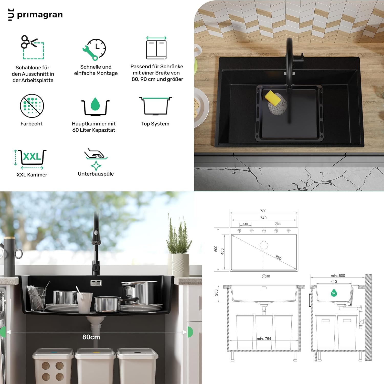 - 🔨 Im set - Spüle Oslo 80 Top, komplettes Abflusssystem (hochwertiger Siphon, Überlauf, zusätzlicher Abfluss für den Anschluss an Waschmaschine oder Geschirrspüler).